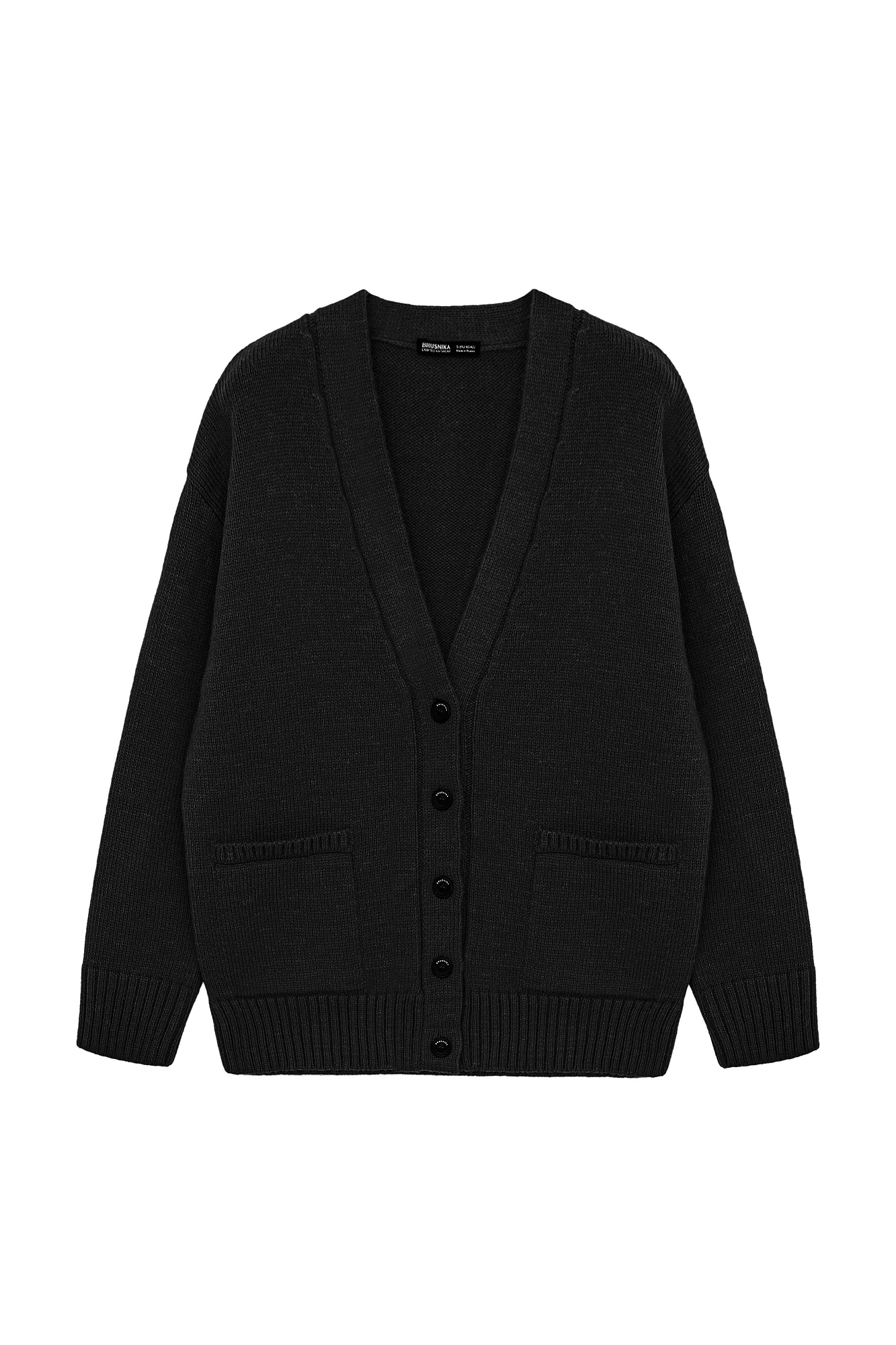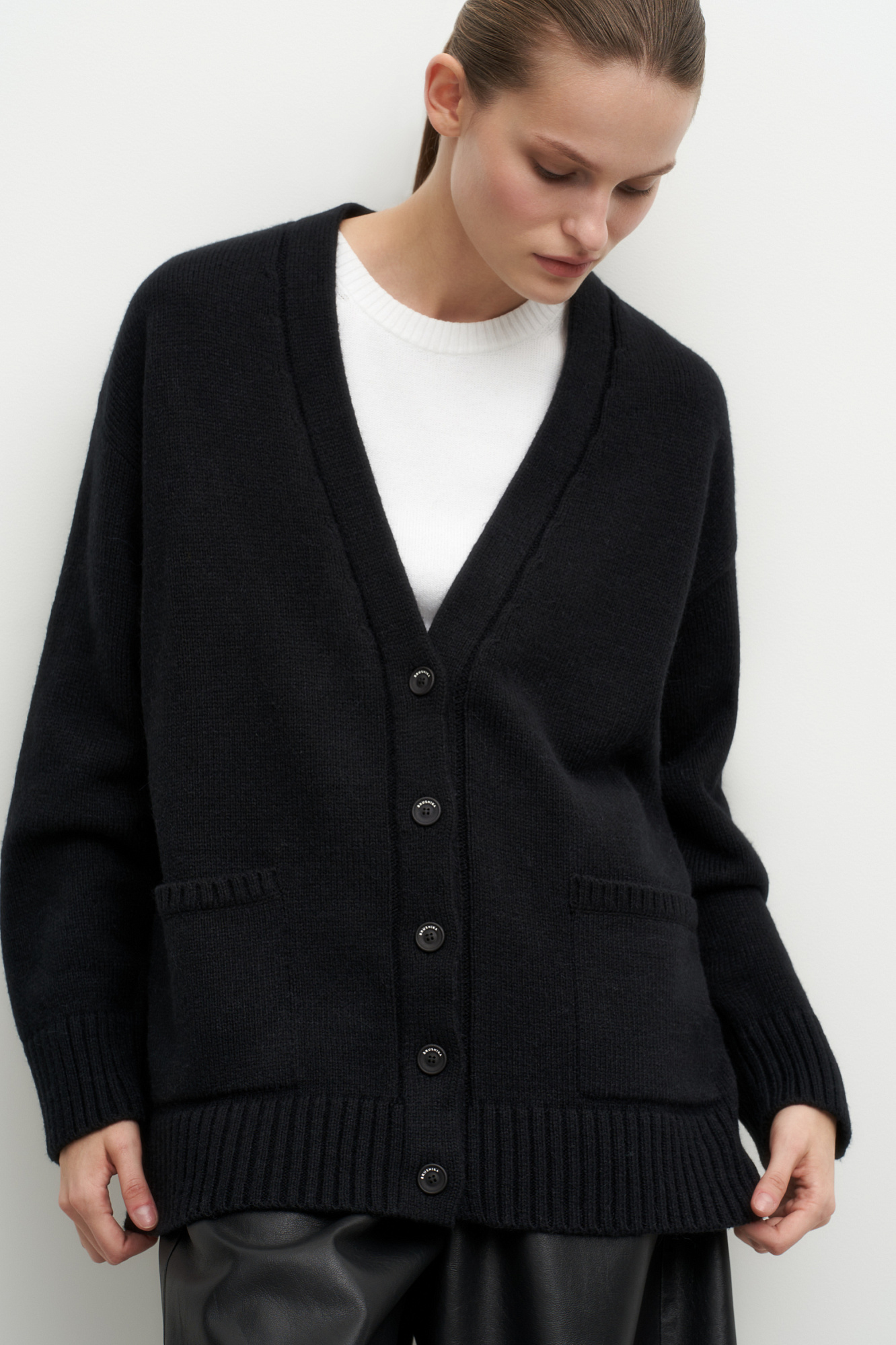 Трикотажный кардиган из шерсти альпака. Модель свободного силуэта с V-образным вырезом и накладными карманами. Края изделия в рубчик.