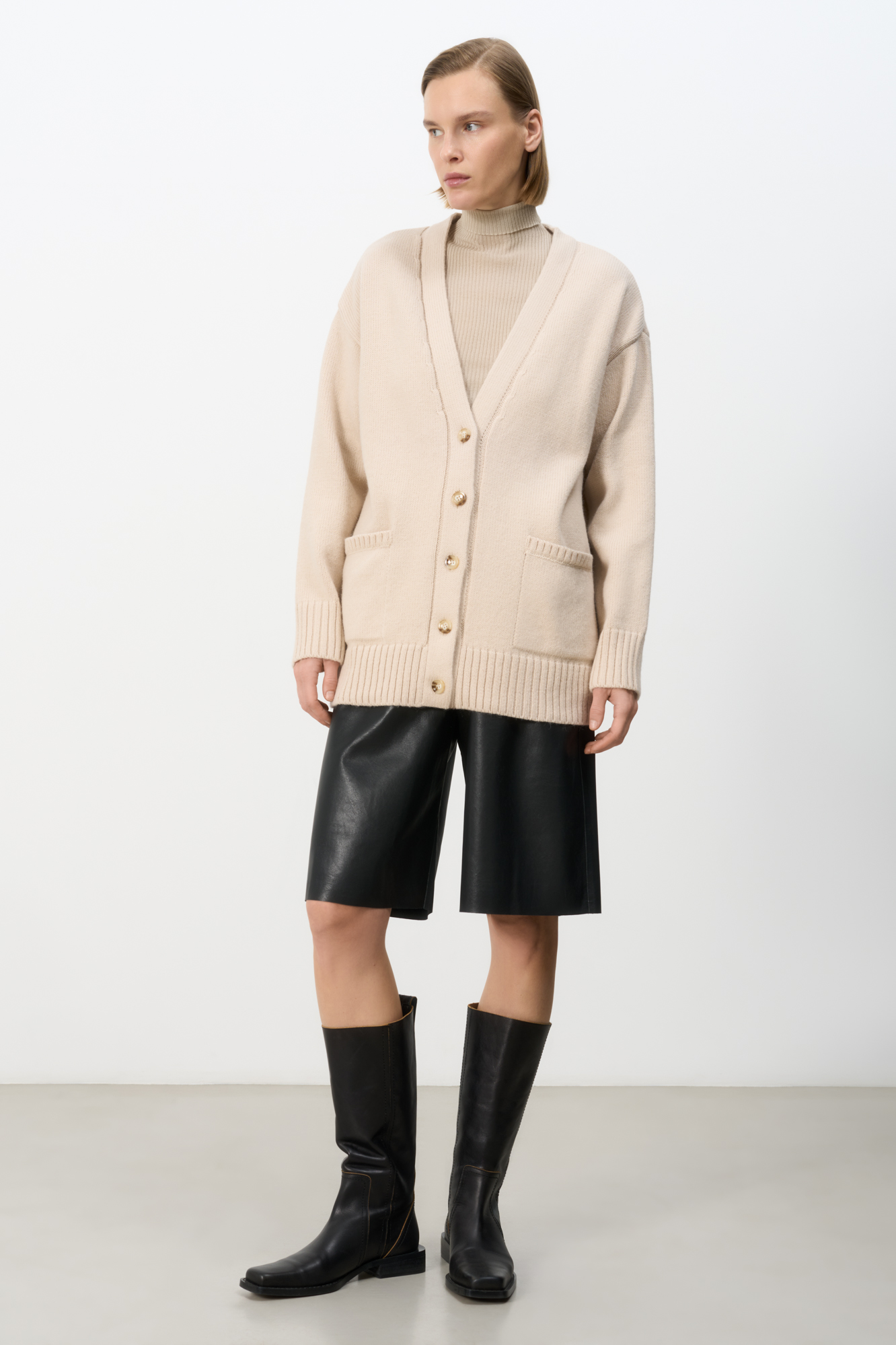 Трикотажный кардиган из шерсти альпака. Модель свободного силуэта с V-образным вырезом и накладными карманами. Края изделия в рубчик.