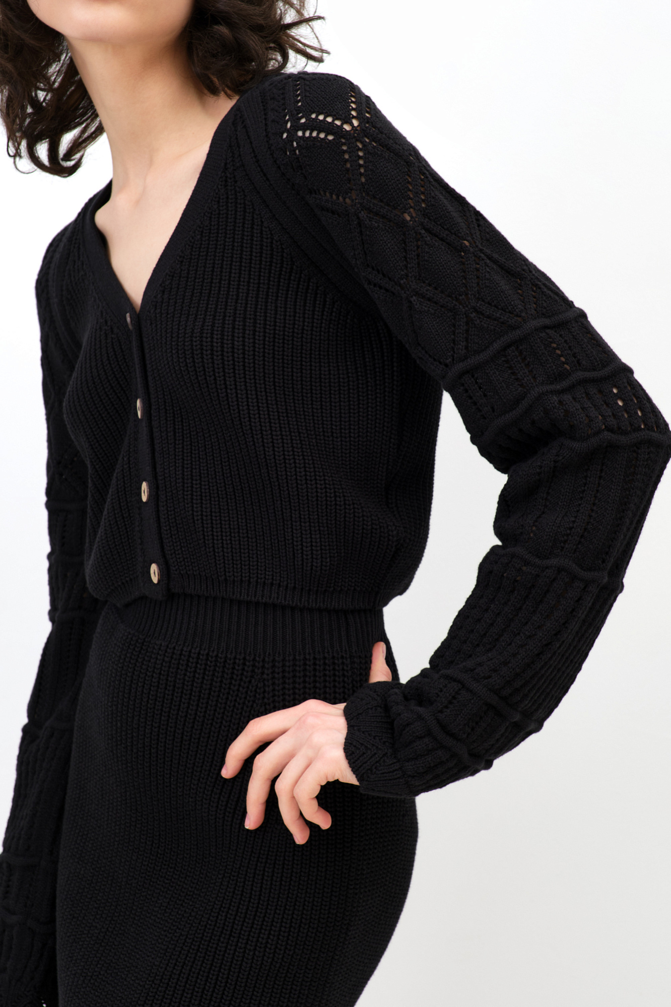 Трикотажный кардиган из хлопка с добавлением эластана. Модель укороченного кроя, с длинными вывязанными рукавами и застежкой на пуговицы.
