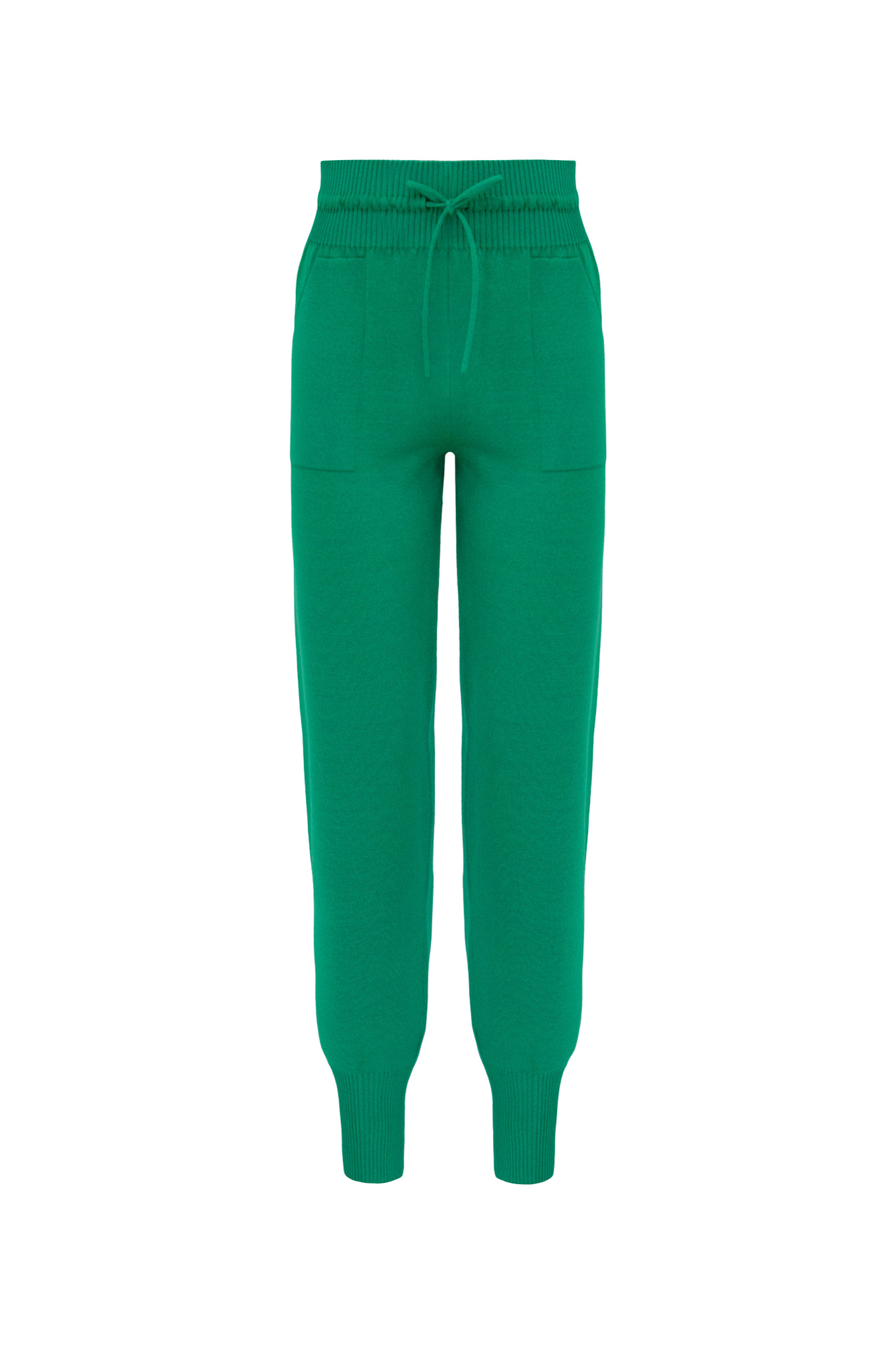 Трикотажыне спортивные брюки. Модель прямого кроя с высокими эластичными манжетами, выполненными в рубчик, регулируемым поясом на кулиске и боковыми карманами.