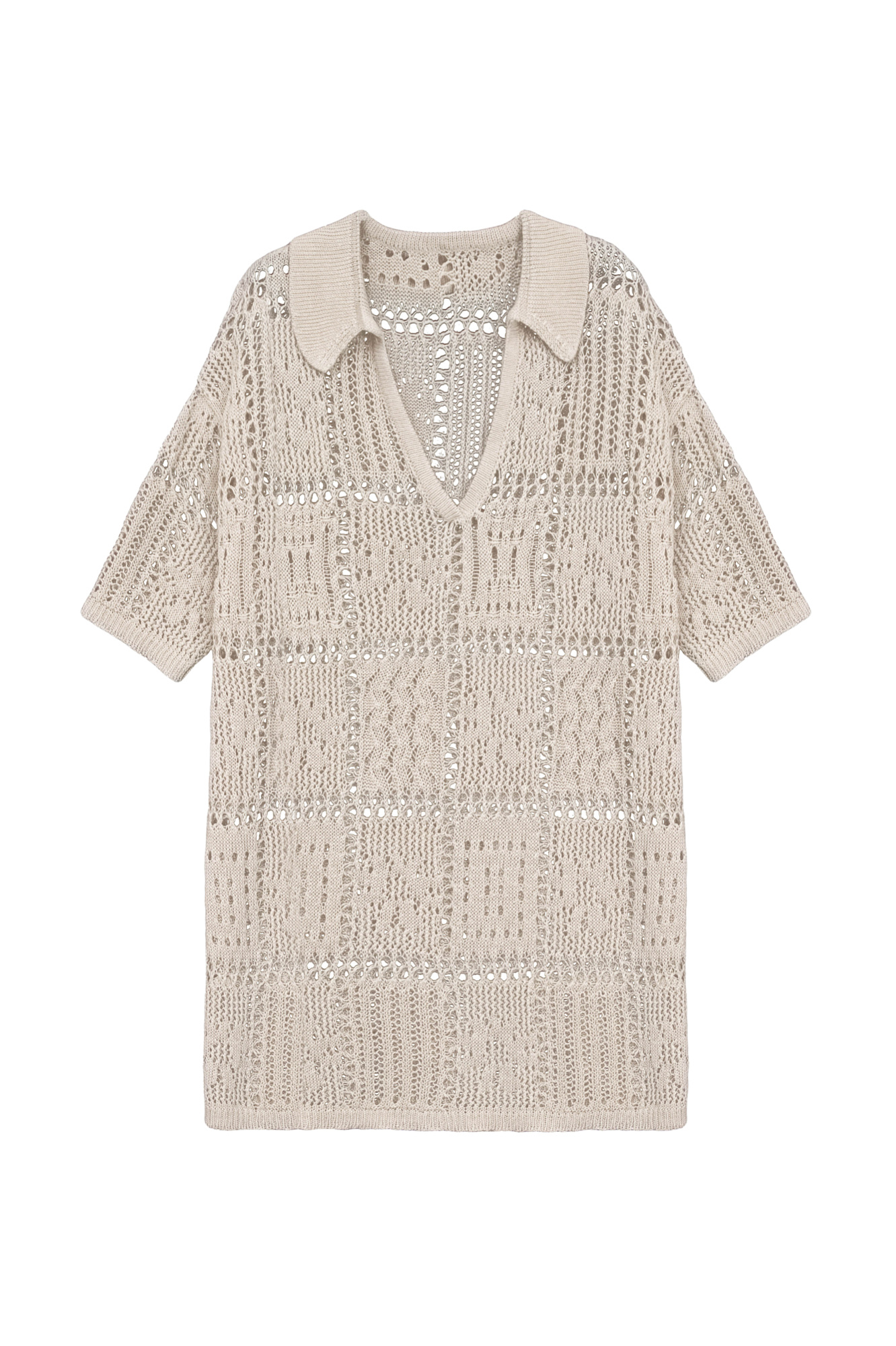 Трикотажный комплект из 100% льна, состоящий из платья длины мини и шорт. Ажурное платье со спущенной линией плеч, рукавом 3/4, V-образным вырезом и отложным воротником. Шорты прямого кроя с эластичным поясом. Края изделия выполнены в рубчик.