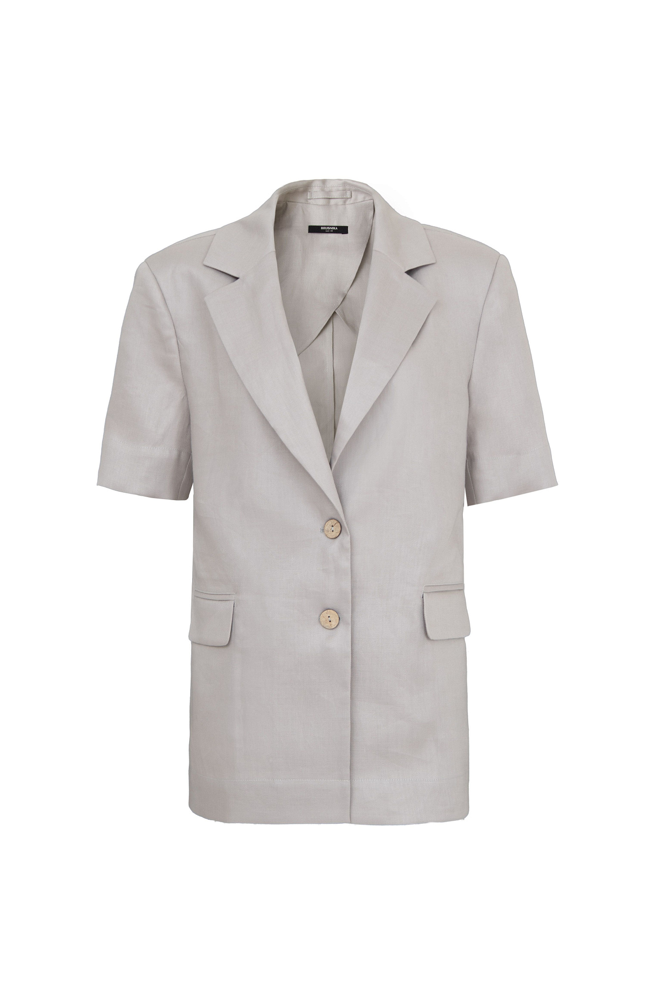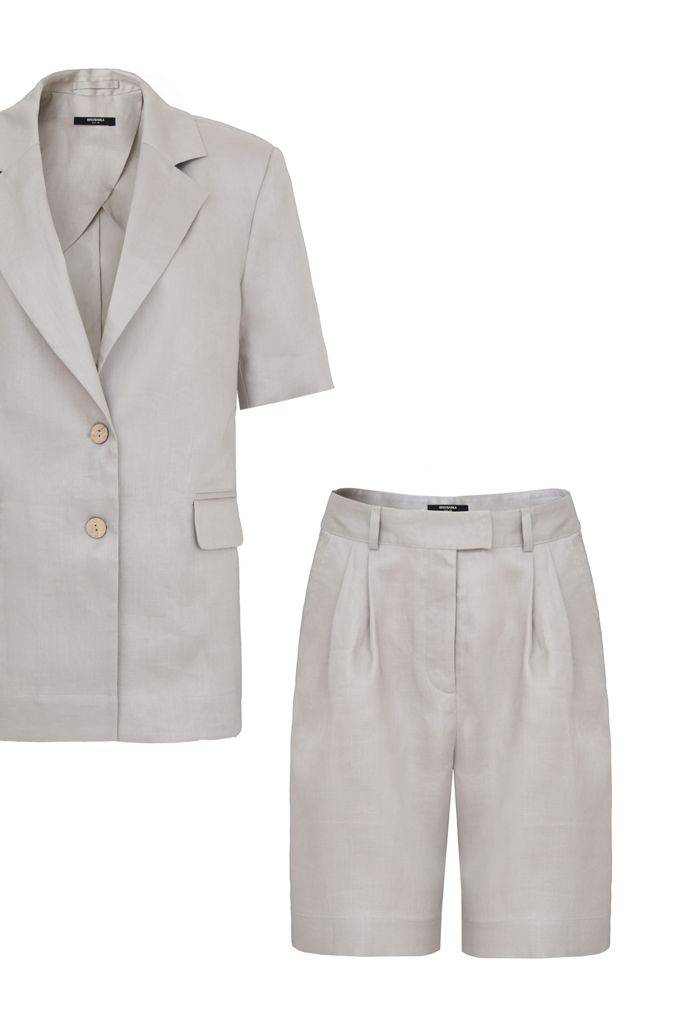 Костюм из 100% льна. Жакет с коротким рукавом и накладными карманами в комплекте с шортами с карманами по бокам.