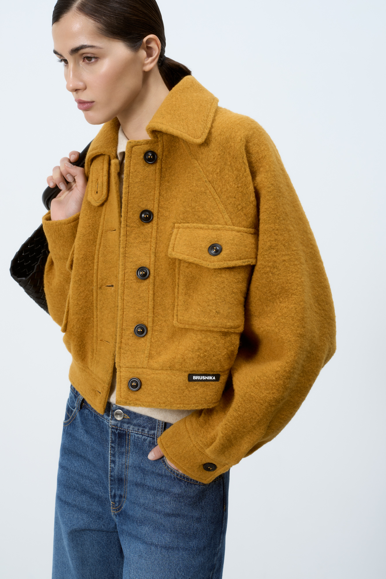 Укороченный жакет из смесовой шерсти. Модель свободного силуэта с накладными карманами, спущенным плечом и воротником-стойкой. Застежка на пуговицы.
