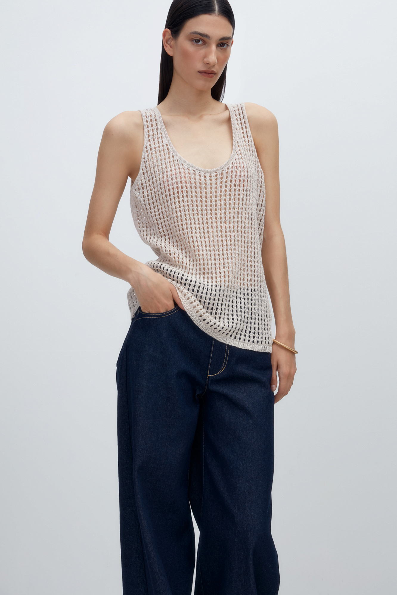 Трикотажная майка из 100% льна в сетку. Модель свободного силуэта с глубокой проймой и круглым вырезом горловины.