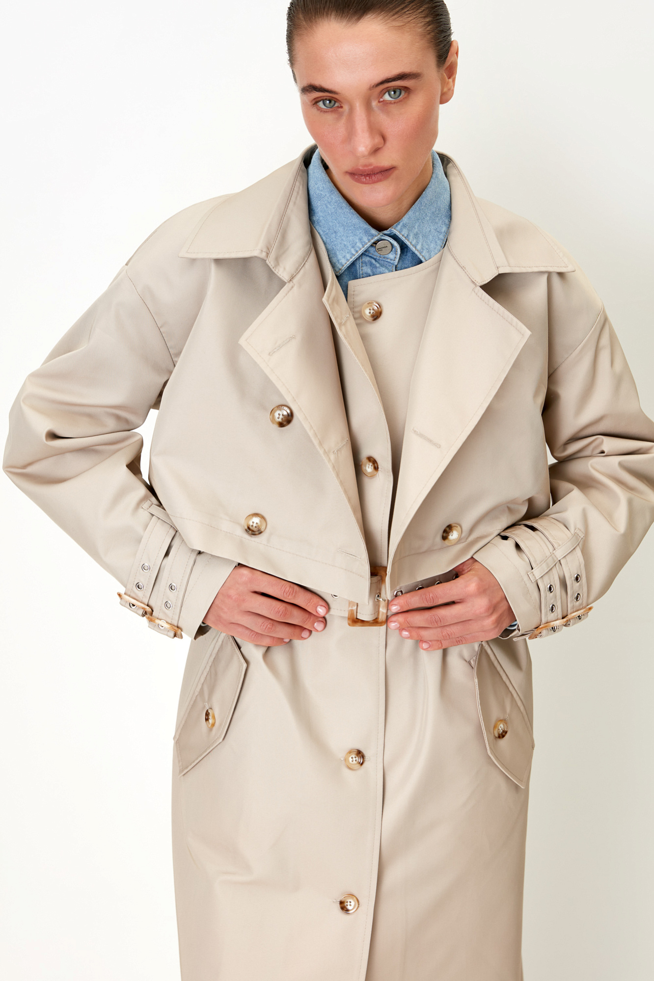 Неповторимый тренчкот трансформер,одна вещь заменяет плащ и удлинённый жилет. Модель свободного кроя дополнена поясом в тон, длинные рукава с патами на манжетах. Застежка на пуговицы.