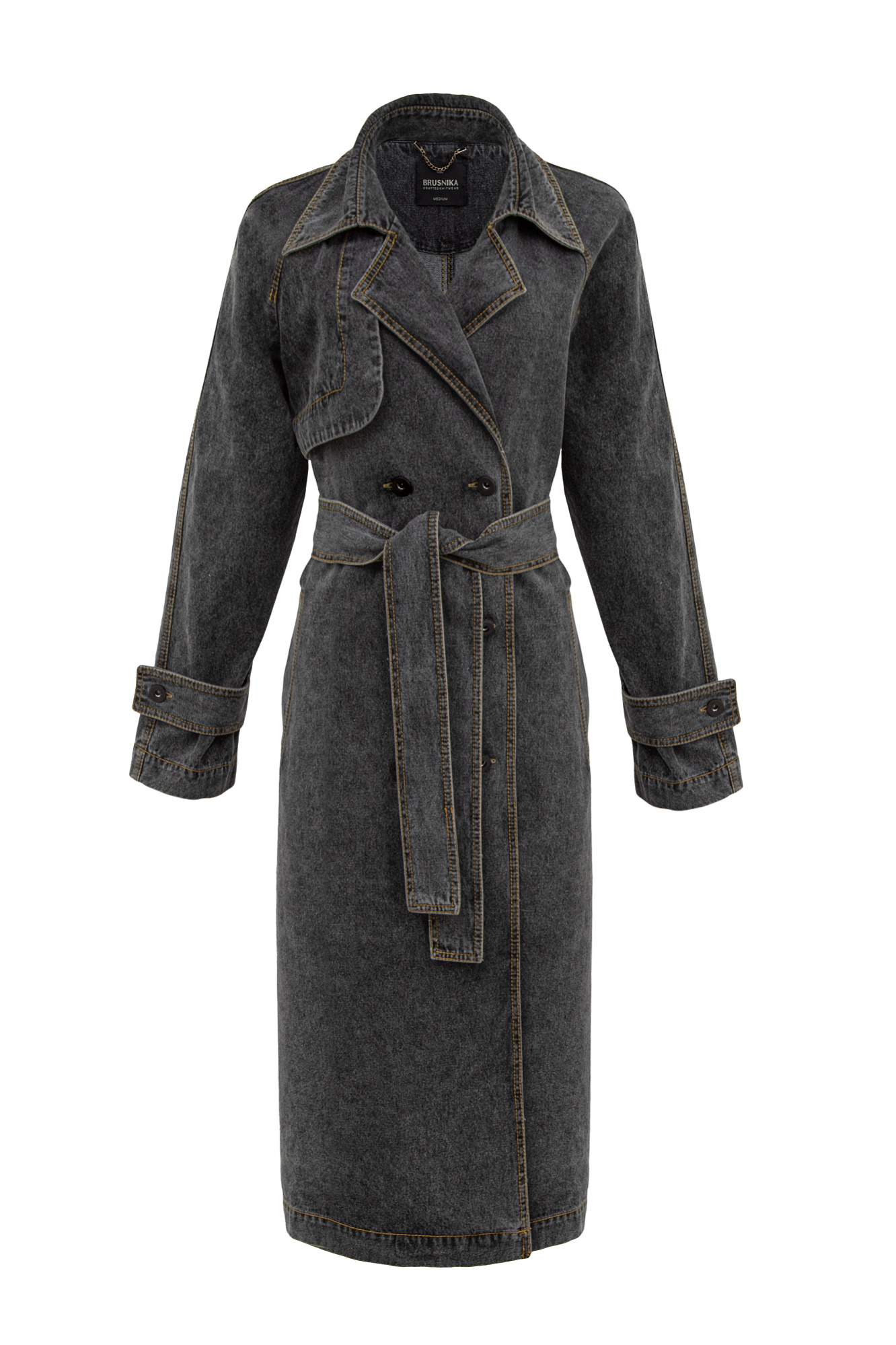 Двубортный тренч из денима на запах без подкладки. Асимметричная отлетная кокетка, отложной воротник, паты на манжетах и широкий пояс из основного материала. Передние боковые карманы на пуговицах.