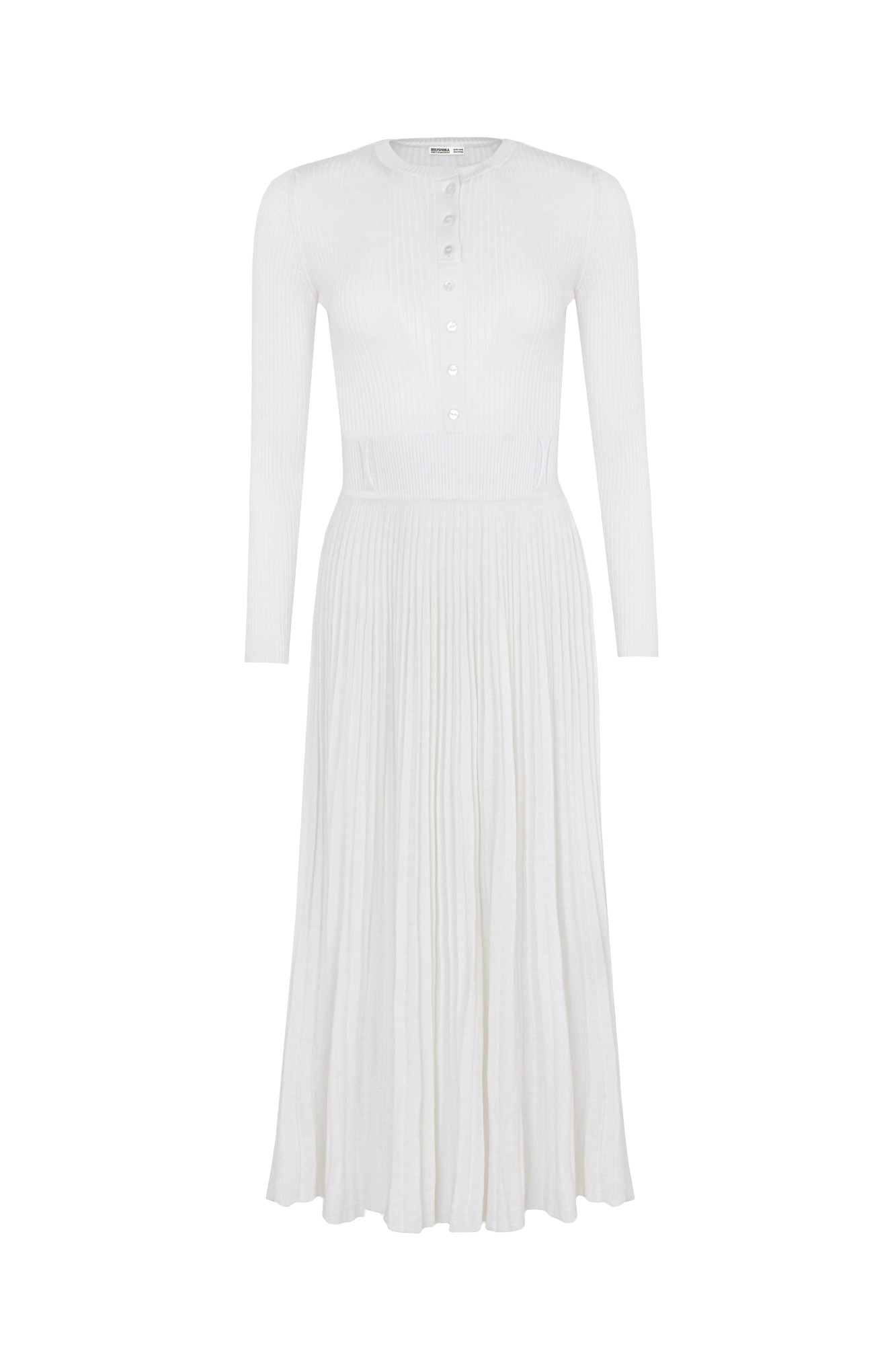 Платье из шерсти и вискозы миди длины с юбкой-плиссе и планкой с пуговицами на груди.