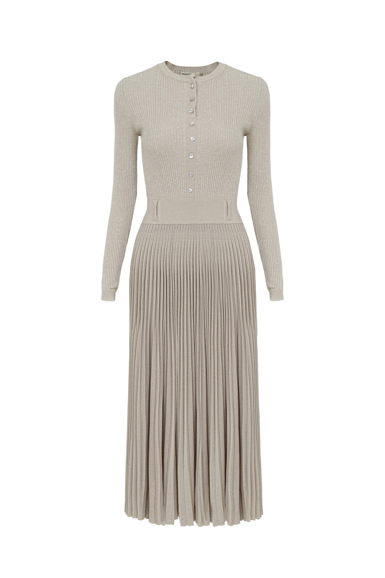 Платье из шерсти и вискозы миди длины с юбкой-плиссе и планкой с пуговицами на груди. Имеется подъюбник.