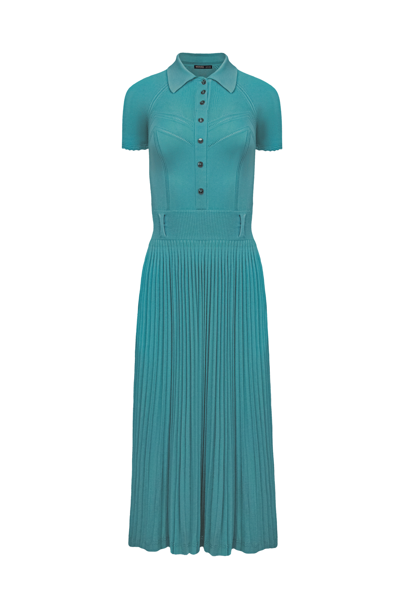 Трикотажное платье миди длины с плиссированной юбкой. Отложной воротник поло и планка с пуговицами на груди. Пояс-резинка на талии со шлевками под ремень.
