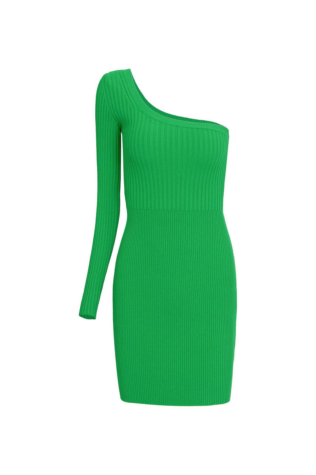 Трикотажное платье длины мини из вискозы. Модель приталенного силуэта с одним рукавом и открытым плечом.