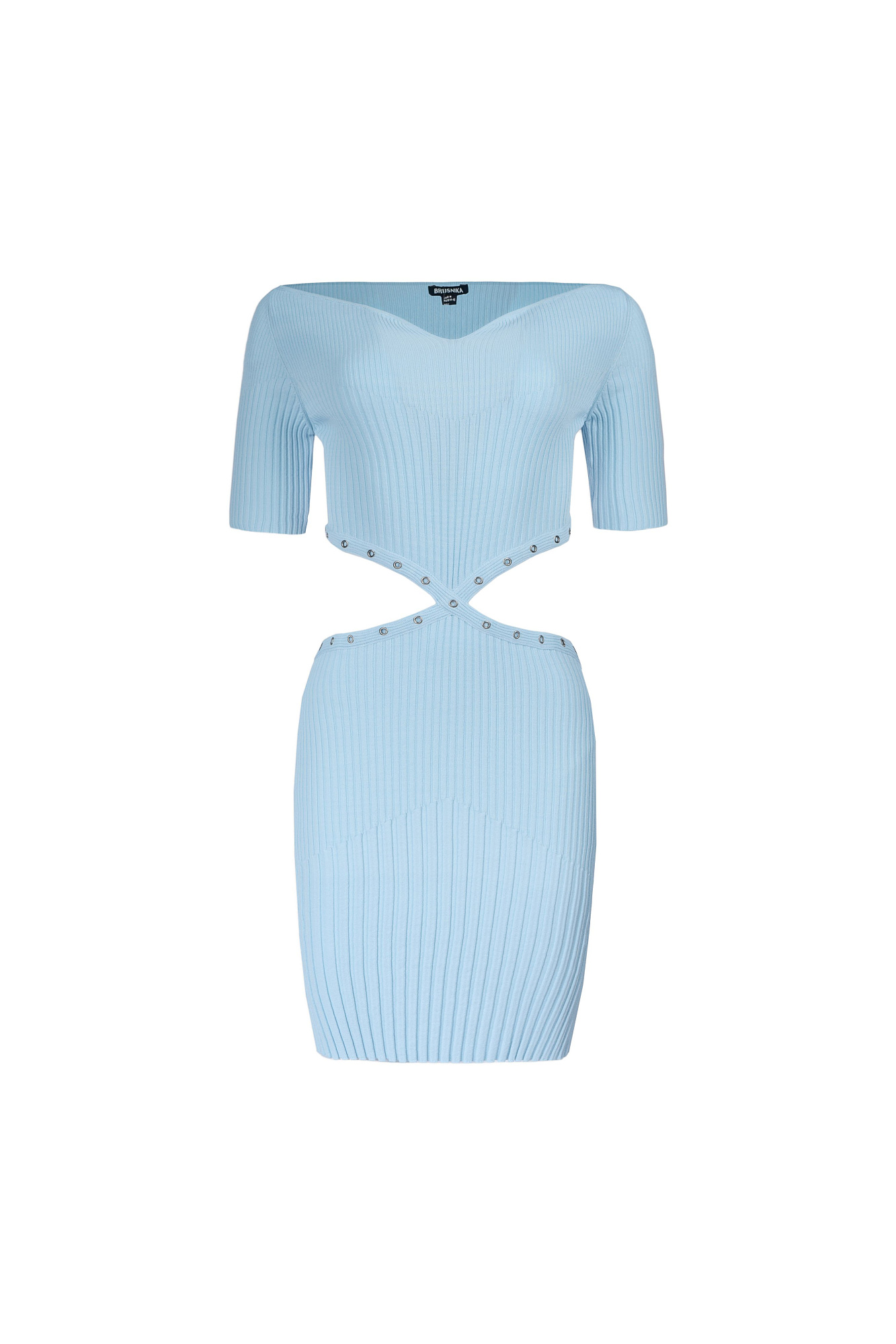 Трикотажное платье в широкий рубчик с вырезами по бокам и короткими рукавами.