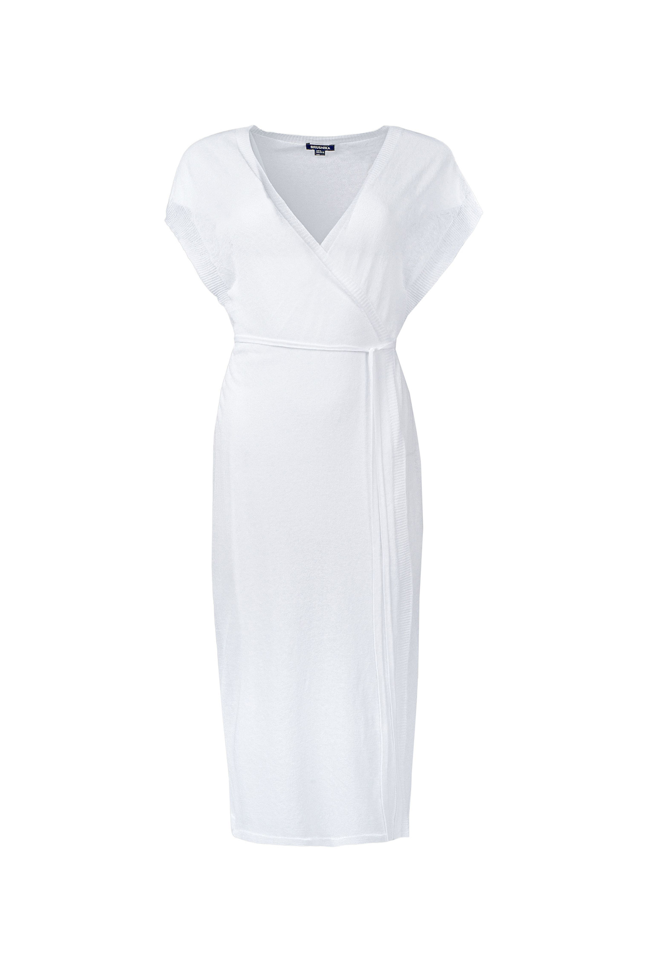 Цельновязаное полупрозрачное платье на запах с поясом.