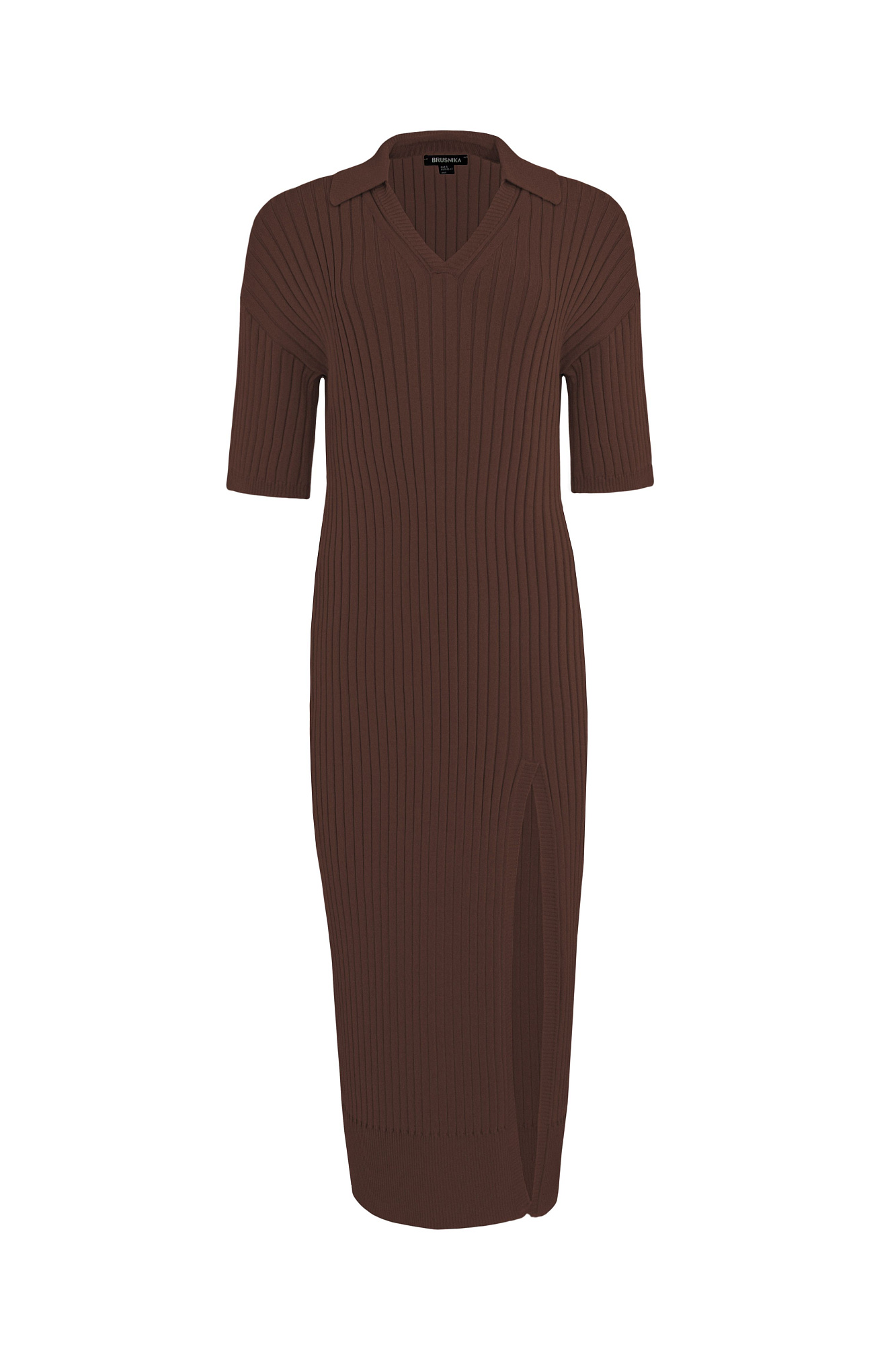 Элегантное трикотажное платье в рубчик с воротником поло и разрезом спереди. Рукав 3/4 длины.