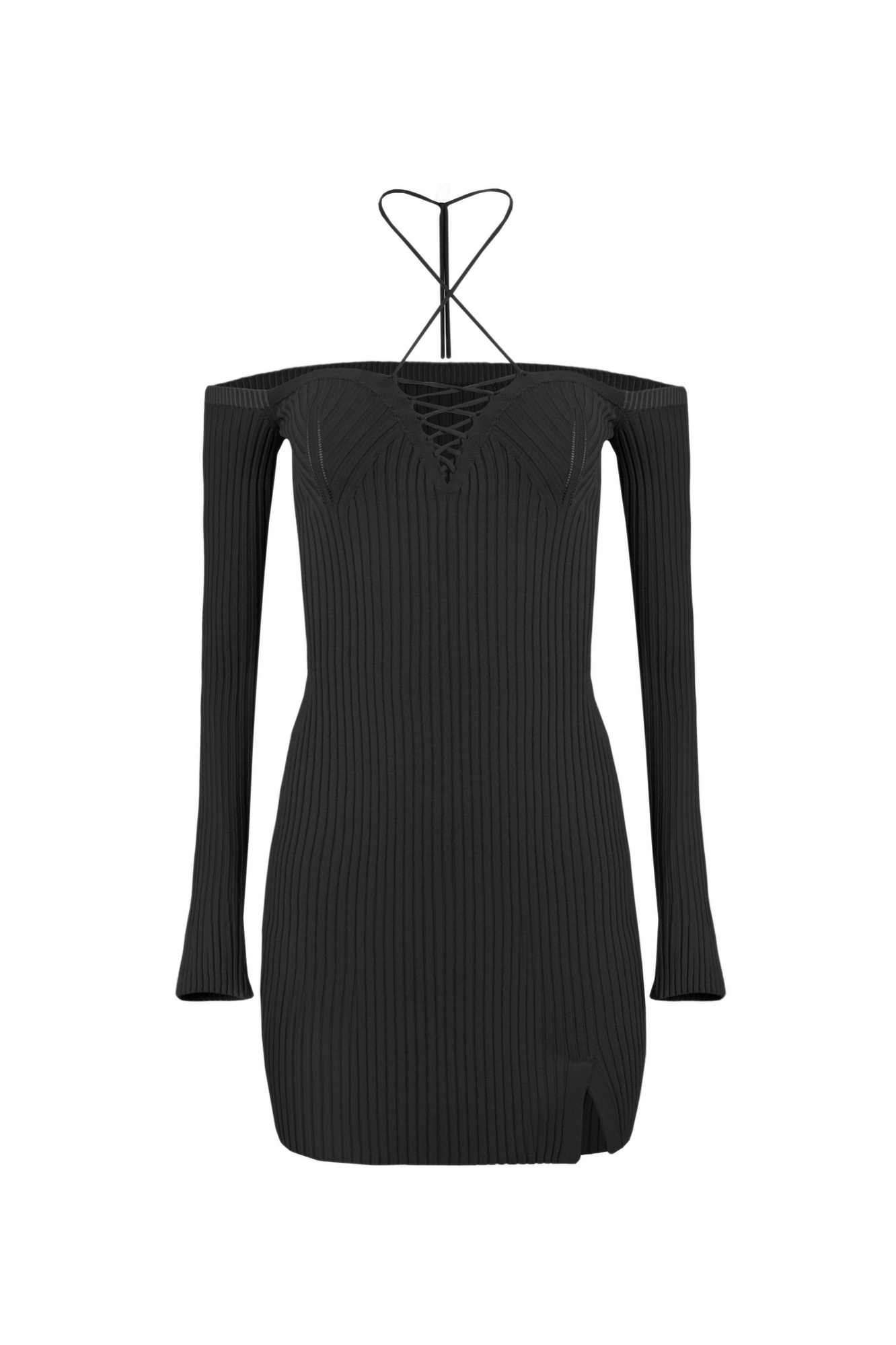 Оригинальное платье-мини с открытыми плечами, длинным расклешенным рукавом, с разрезом спереди на шнуровке, красивое вывязанное декольте, небольшой разрез внизу