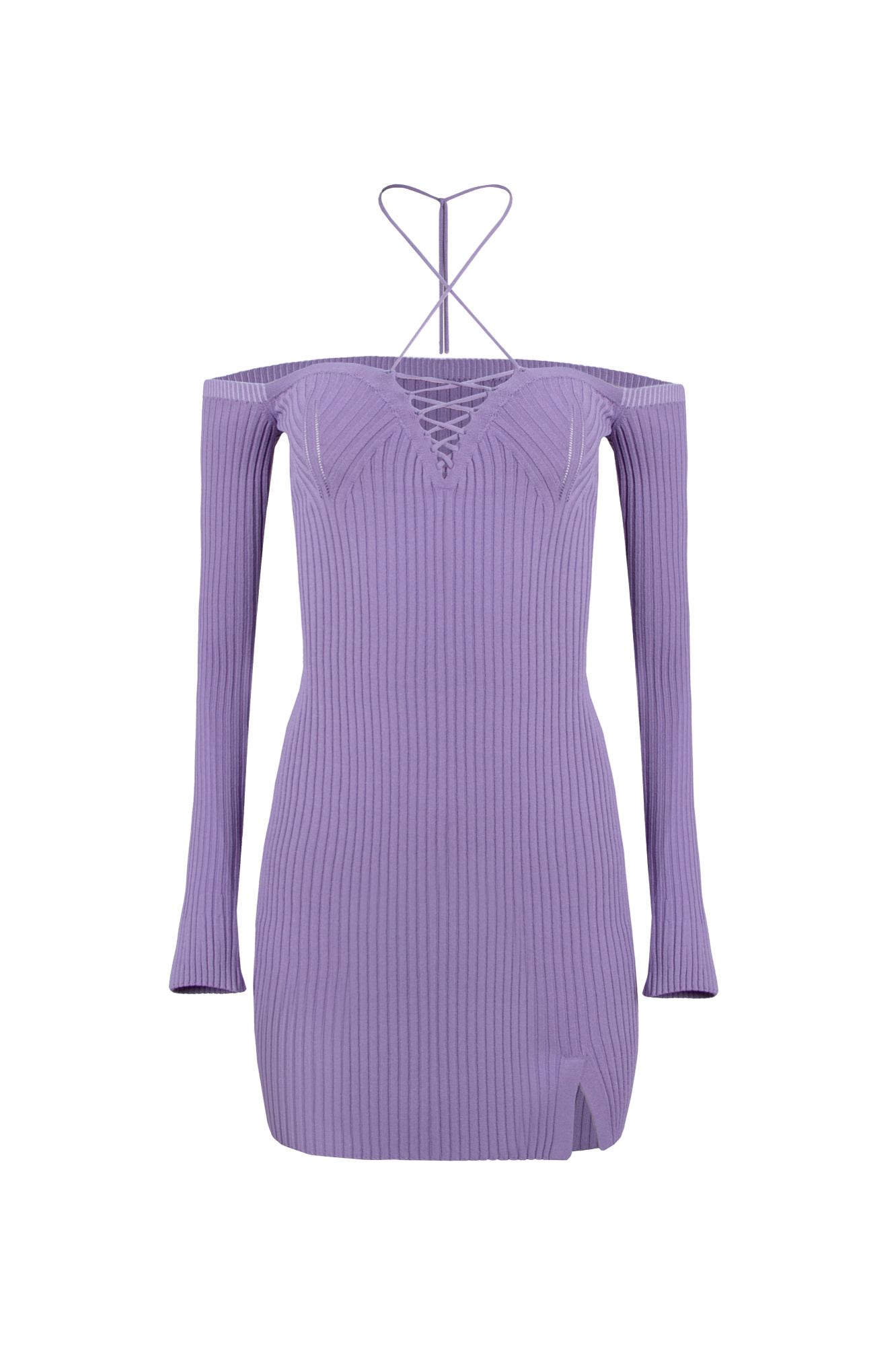 Оригинальное платье-мини с открытыми плечами, длинным расклешенным рукавом, с разрезом спереди на шнуровке, красивое вывязанное декольте, небольшой разрез внизу.