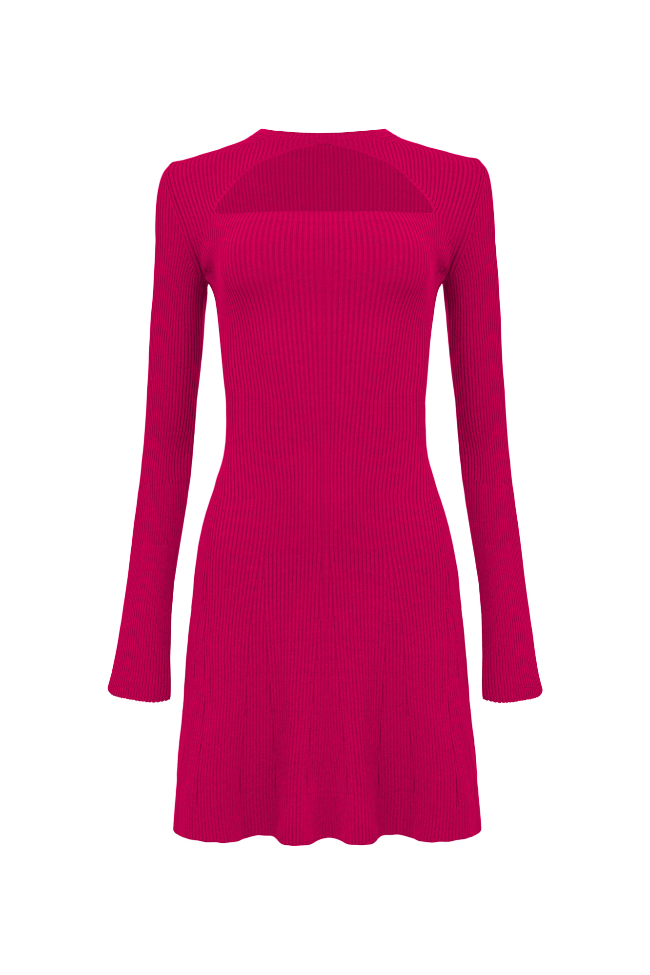 Трикотажное платье силуэта песочные часы. Модель длины мини с вырезом на груди и расклешенными рукавами.