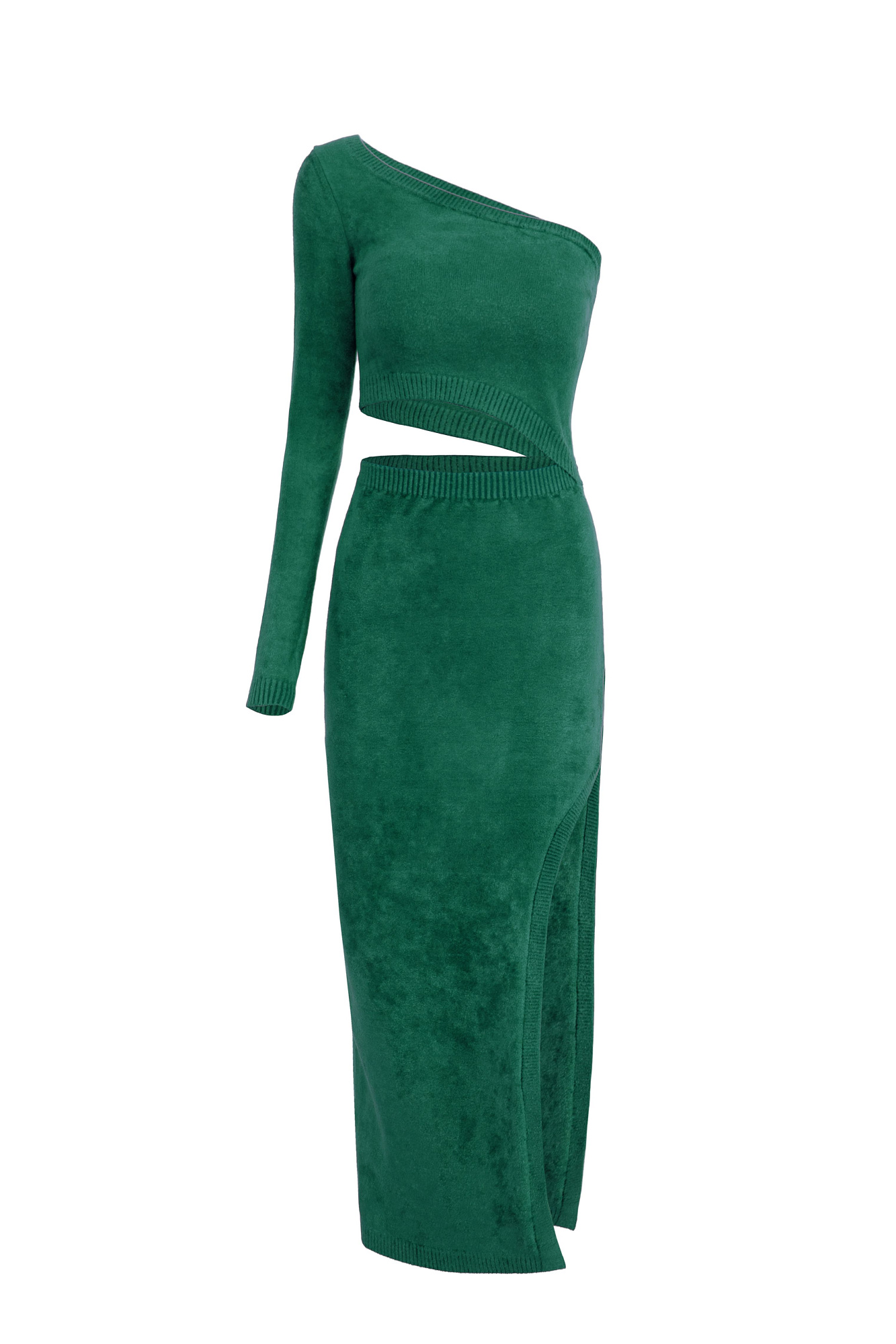 Длинное платье из бархатной вискозы с вырезом на плече и разрезом на ноге.
