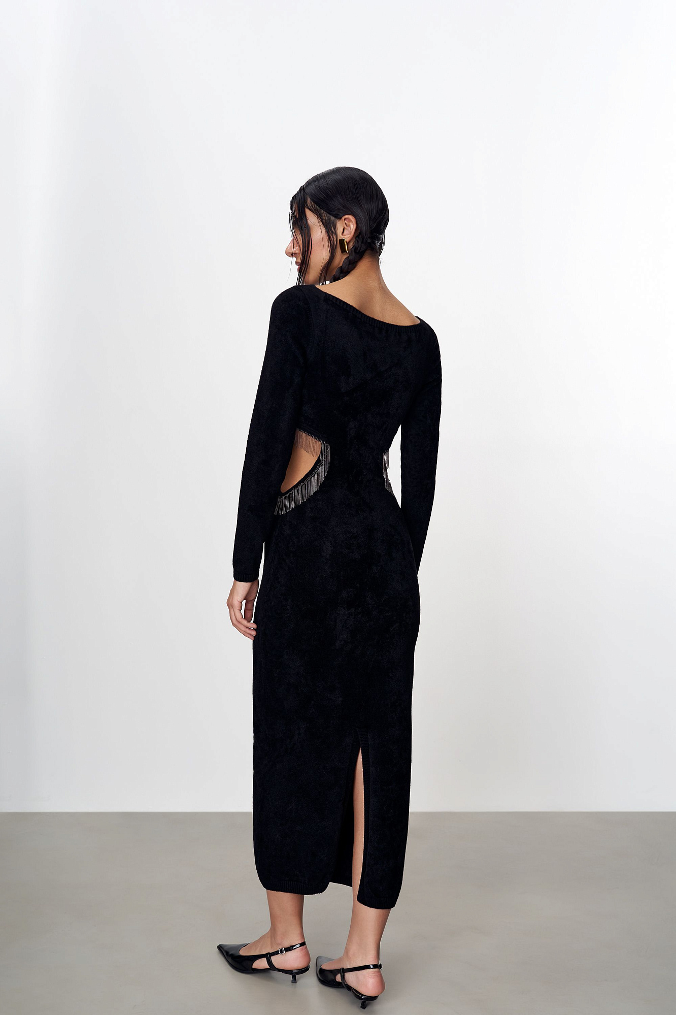 Трикотажное платье из мягкой бархатистой вискозы. Модель с приталенным силуэтом и акцентными разрезами на боках, декорированными металлической бахромой.