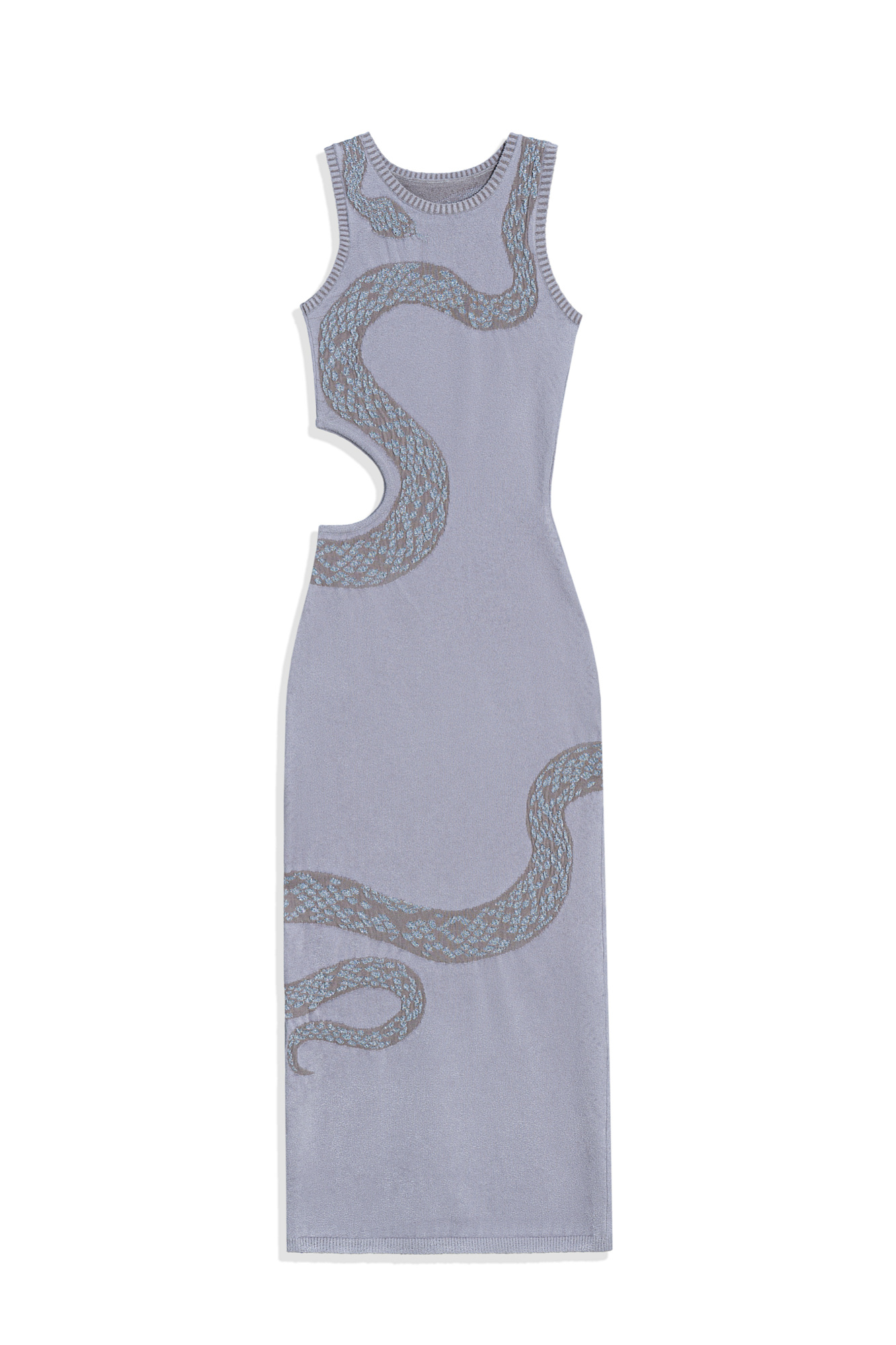 Трикотажное платье длины макси из вискозы. Модель приталенного силуэта, без рукавов, круглым вырезом горловины и вырезом на талии. Края изделия выполнены в рубчик. Ключевой деталью платья является принт в виде змеи, опоясывающий силуэт.