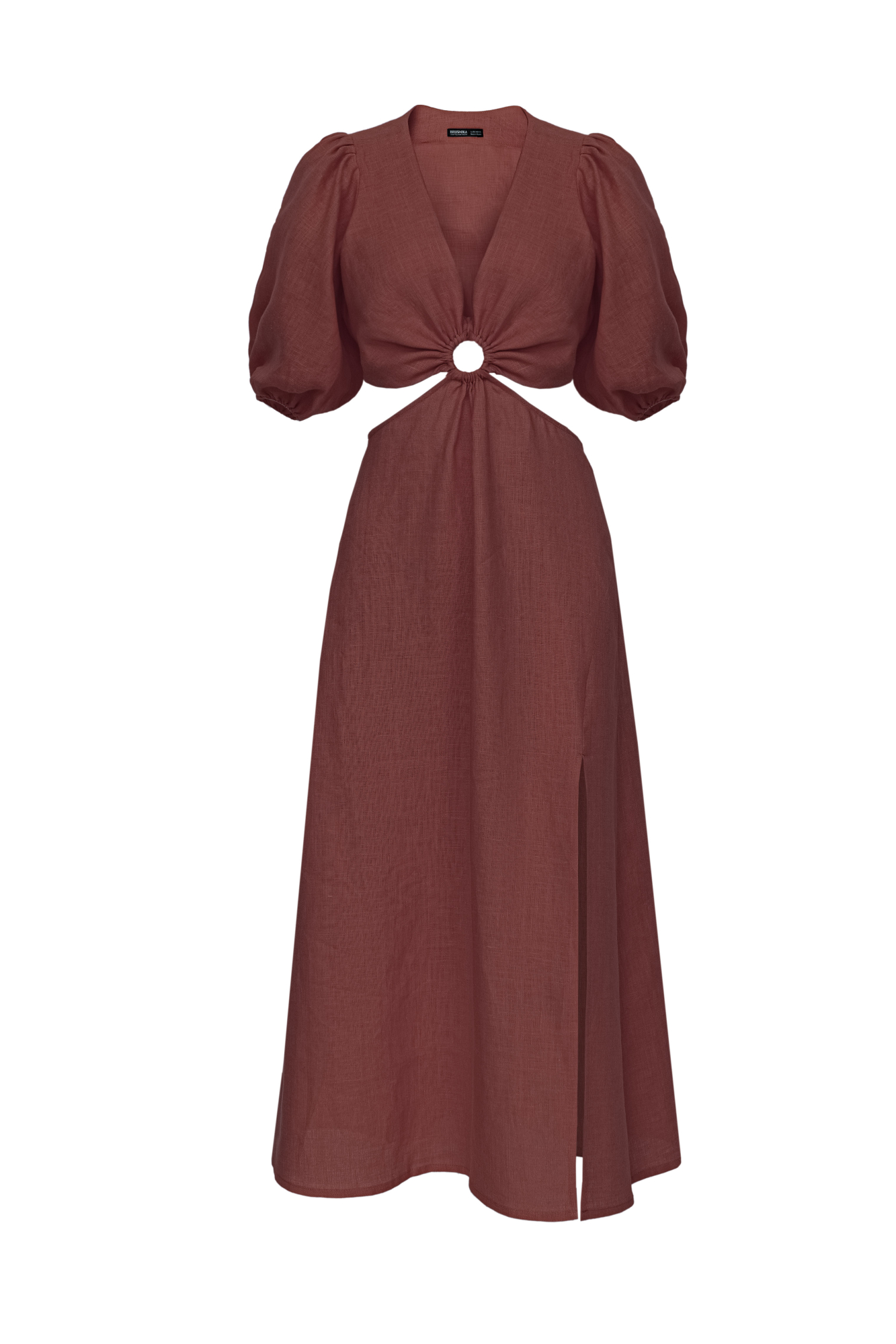 Плать из 100% льна с разрезом сбоку и вырезом на талии. Рукава-фонарики.