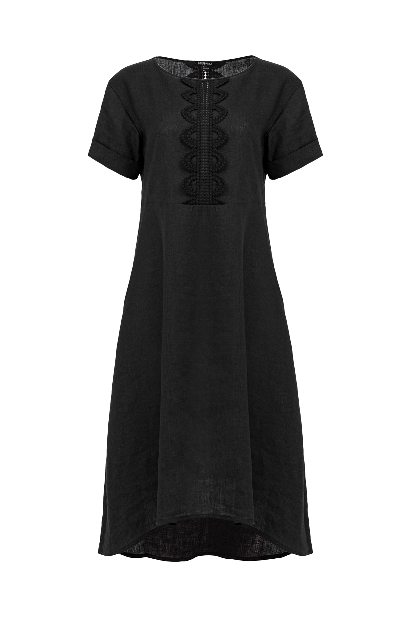 Платье длины миди из 100% льна. Модель с коротким рукавом и круглым вырезом горловины. Изделие декорировано кружевом.