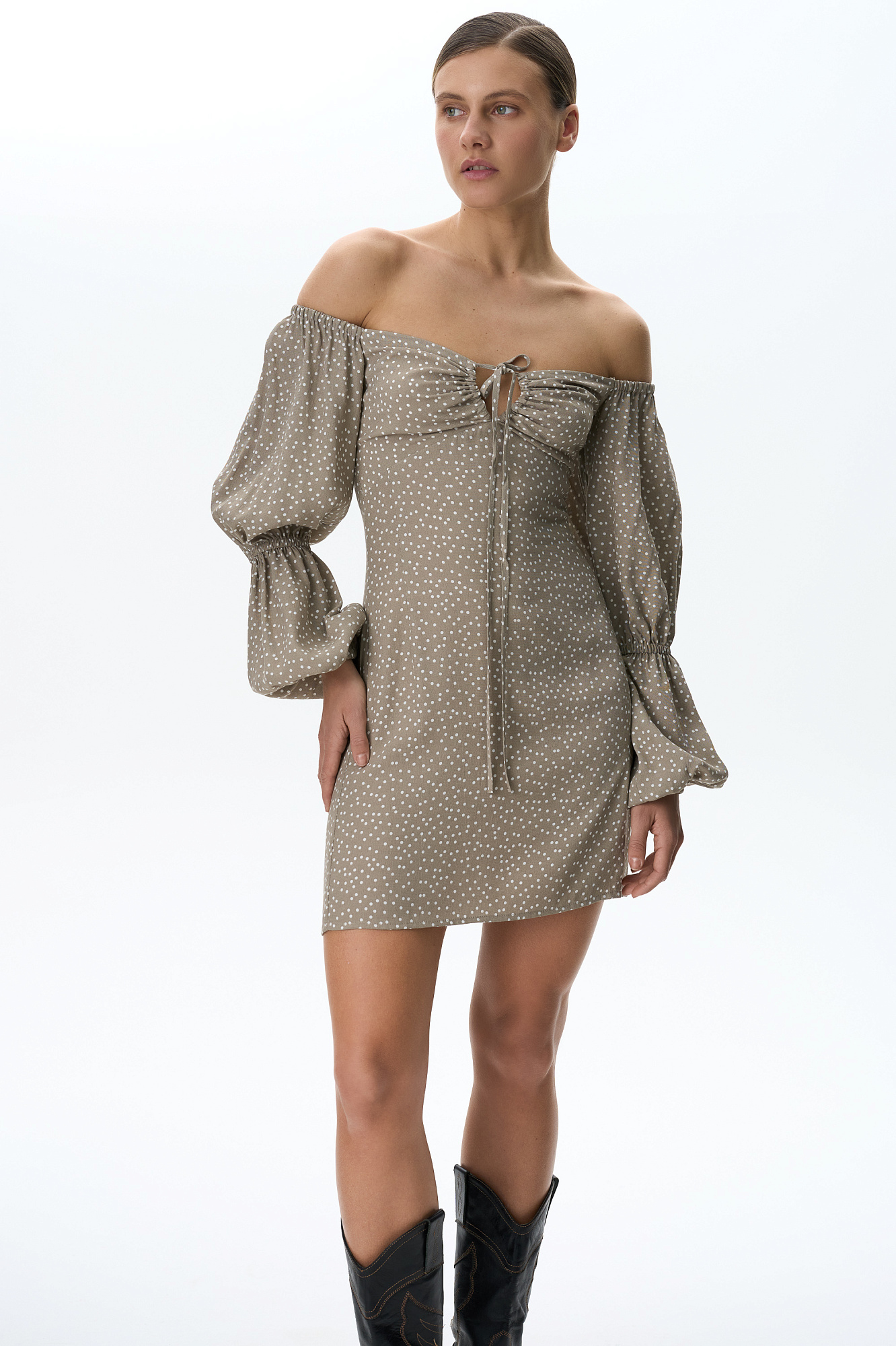 Платье из вискозы в горошек, с рукавами-фонариками и тонкой лентой-завязкой.