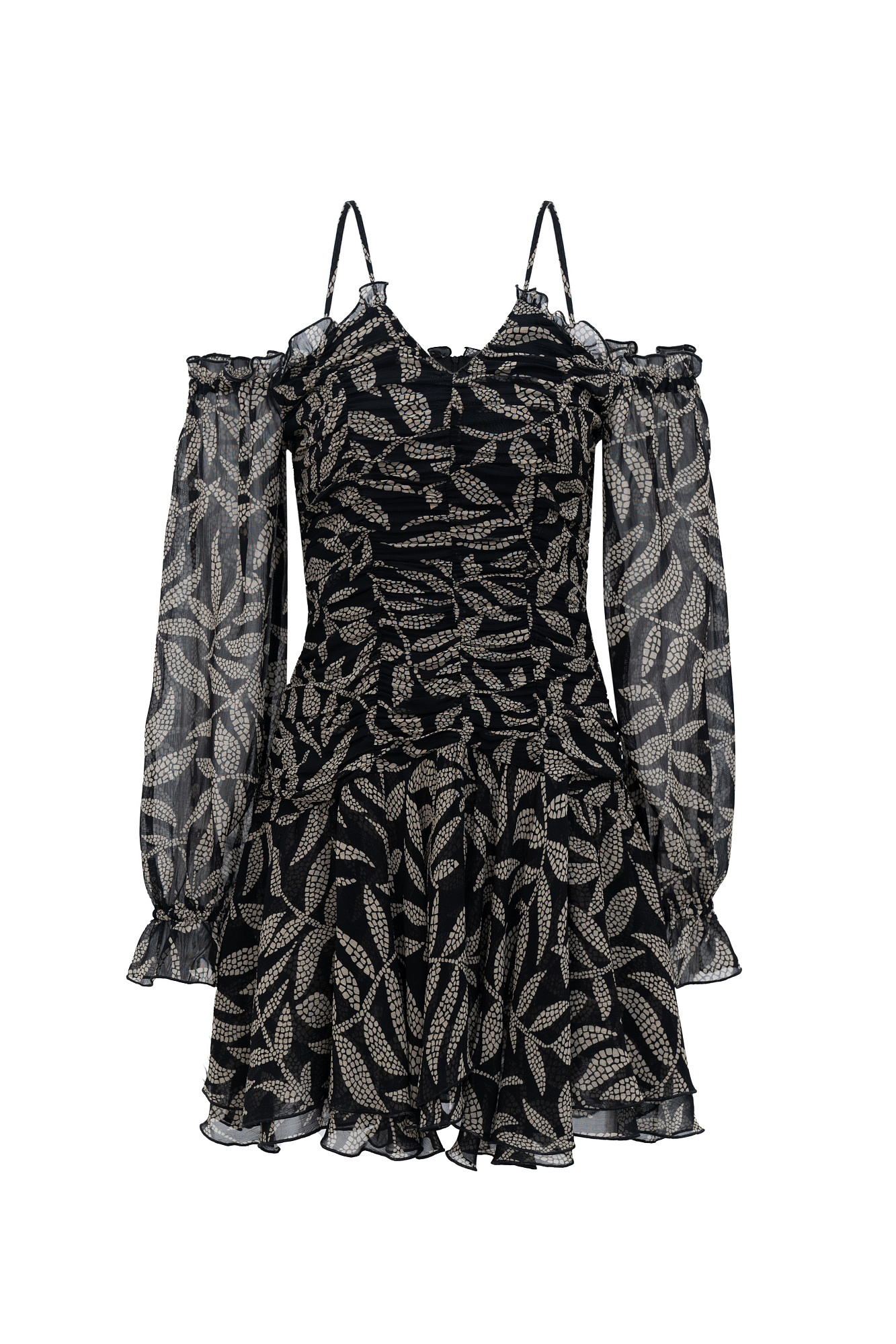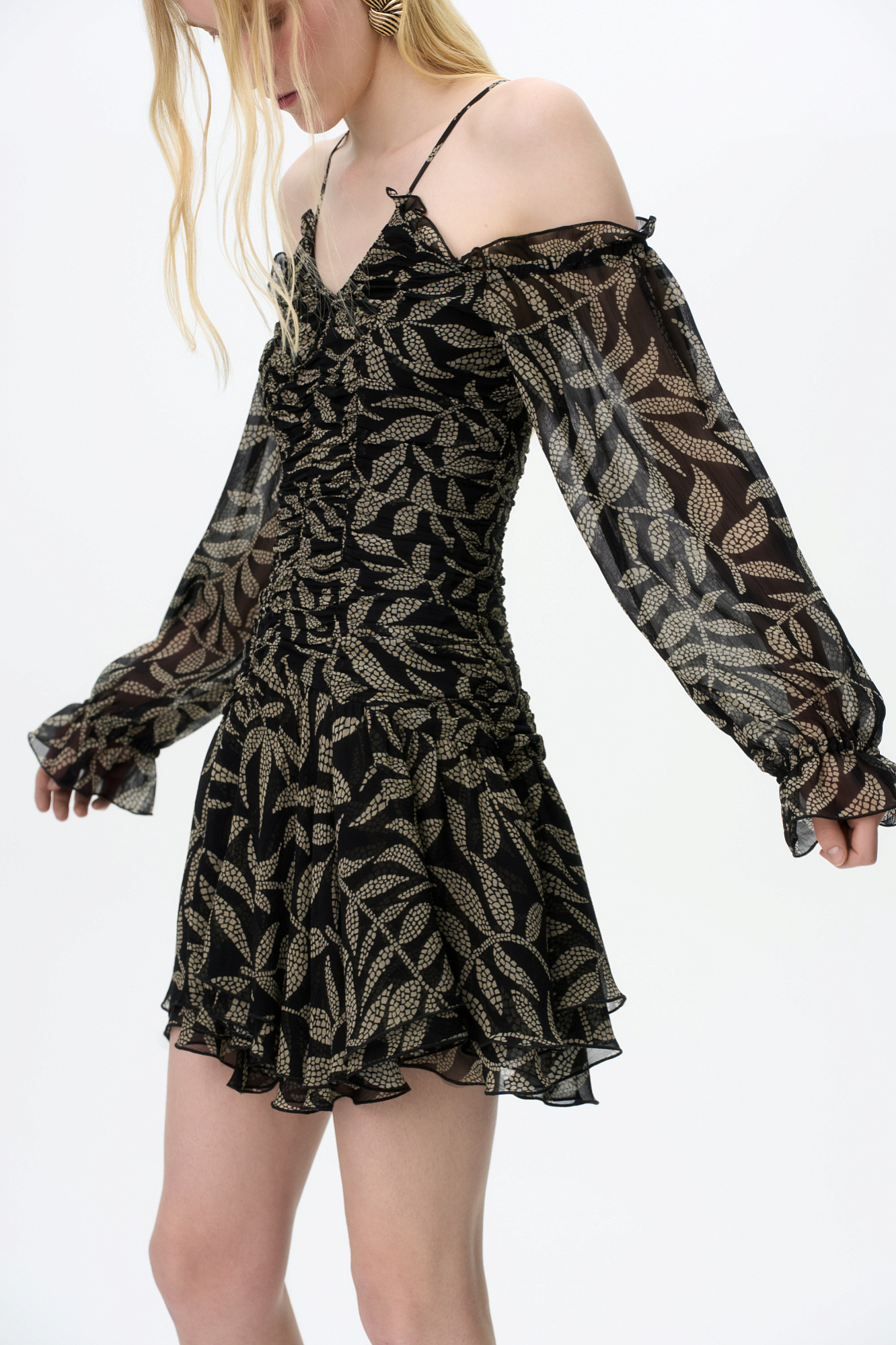 Принтованное платье длины мини. Модель приталенного силуэта на тонких бретелях с открытыми плечами и рукавами-фонариками.