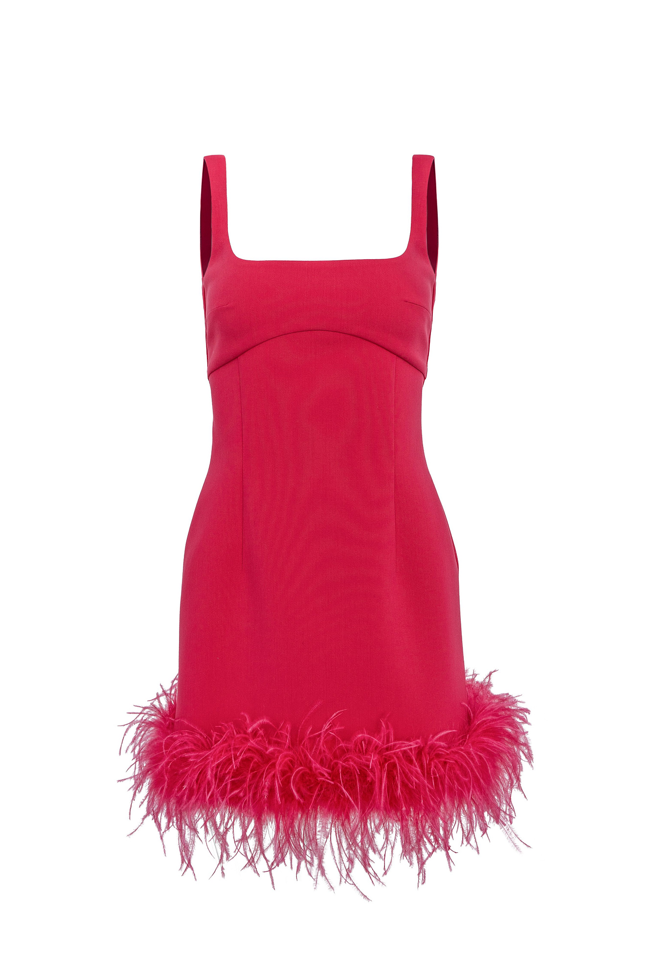 Платье мини из поливискозы. Модель приталенного силуэта с окантовкой из перьев по нижнему краю.