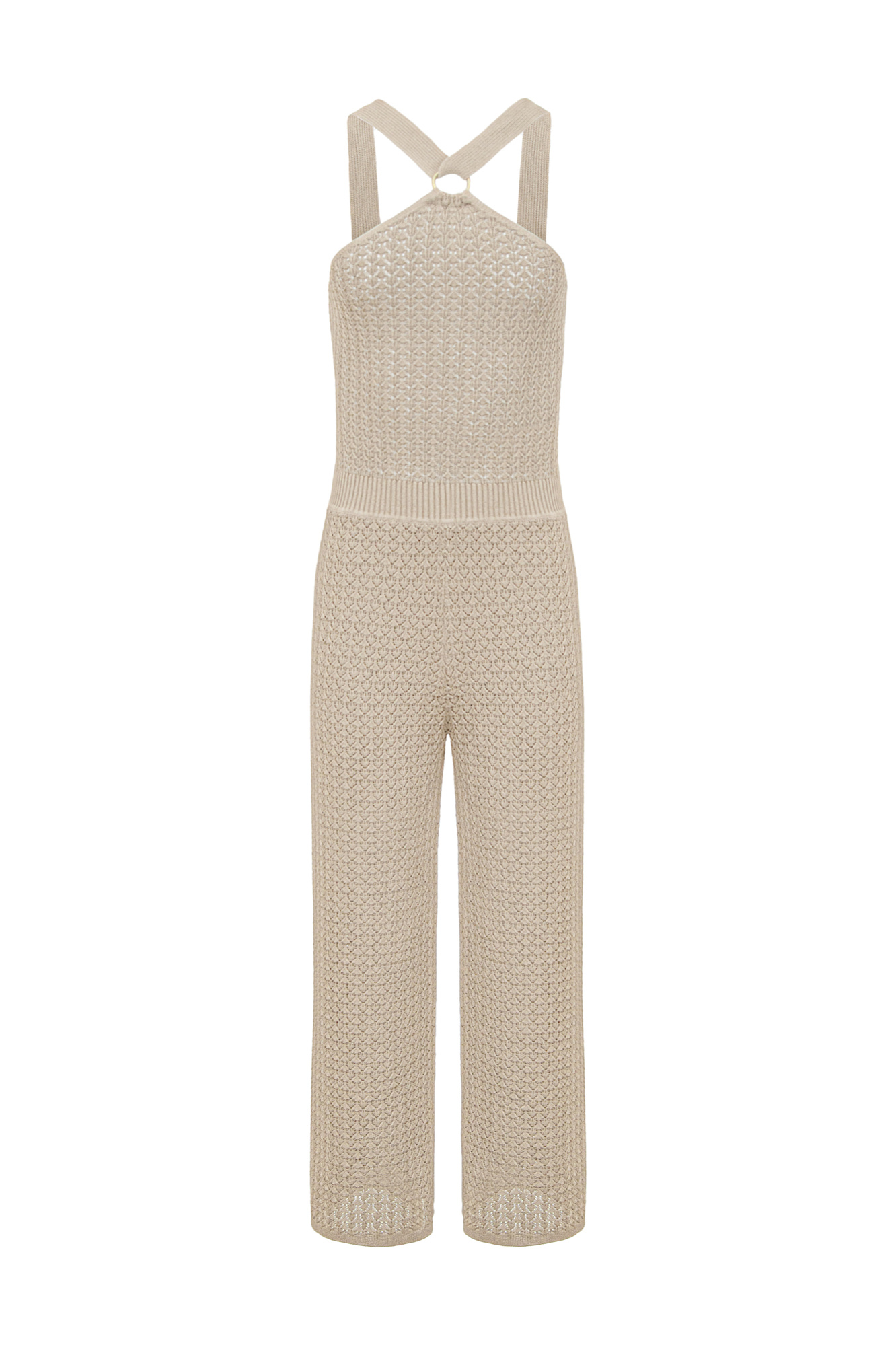 Трикотажный ажурный комбинезон на широких лямках с застежкой на кольце.