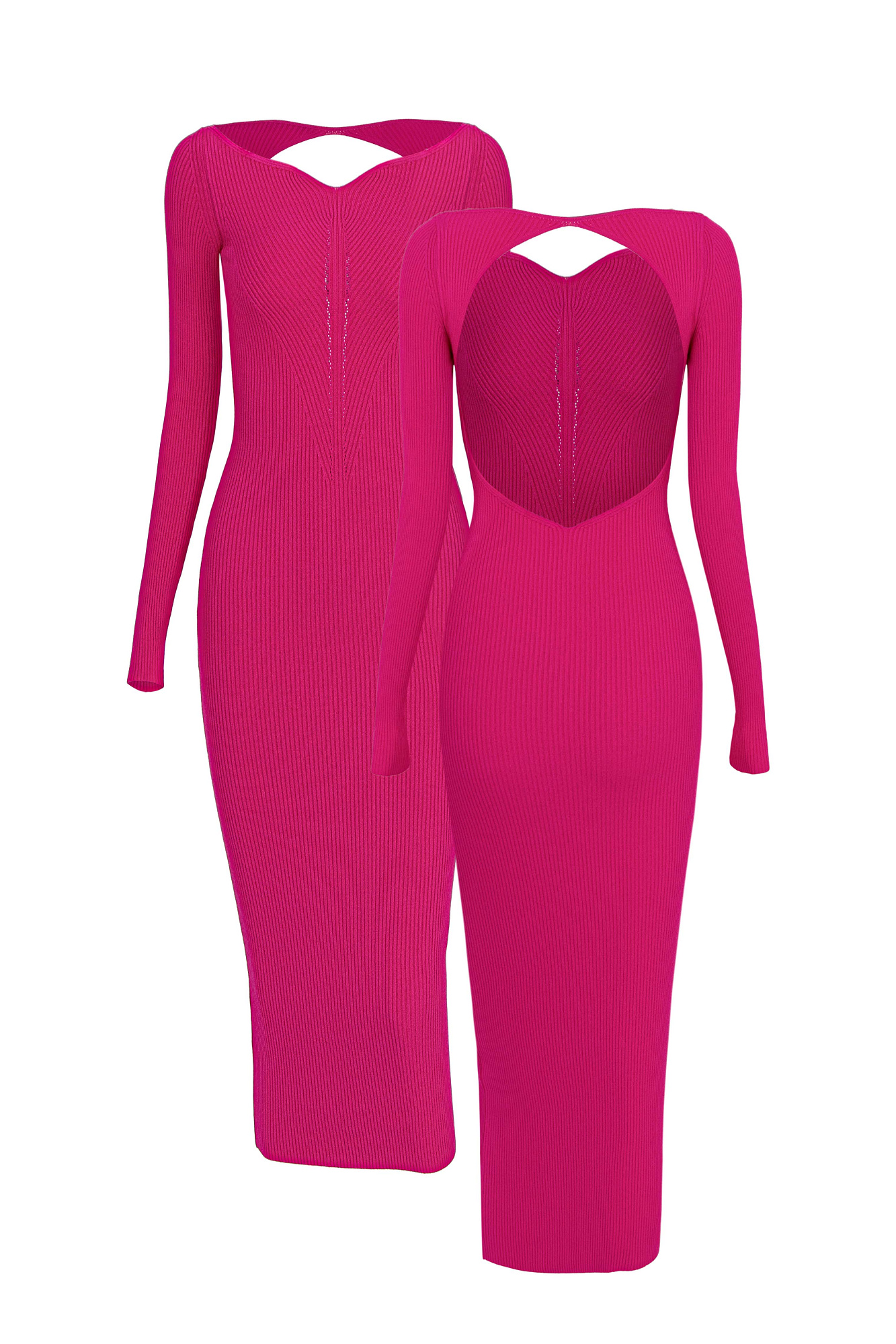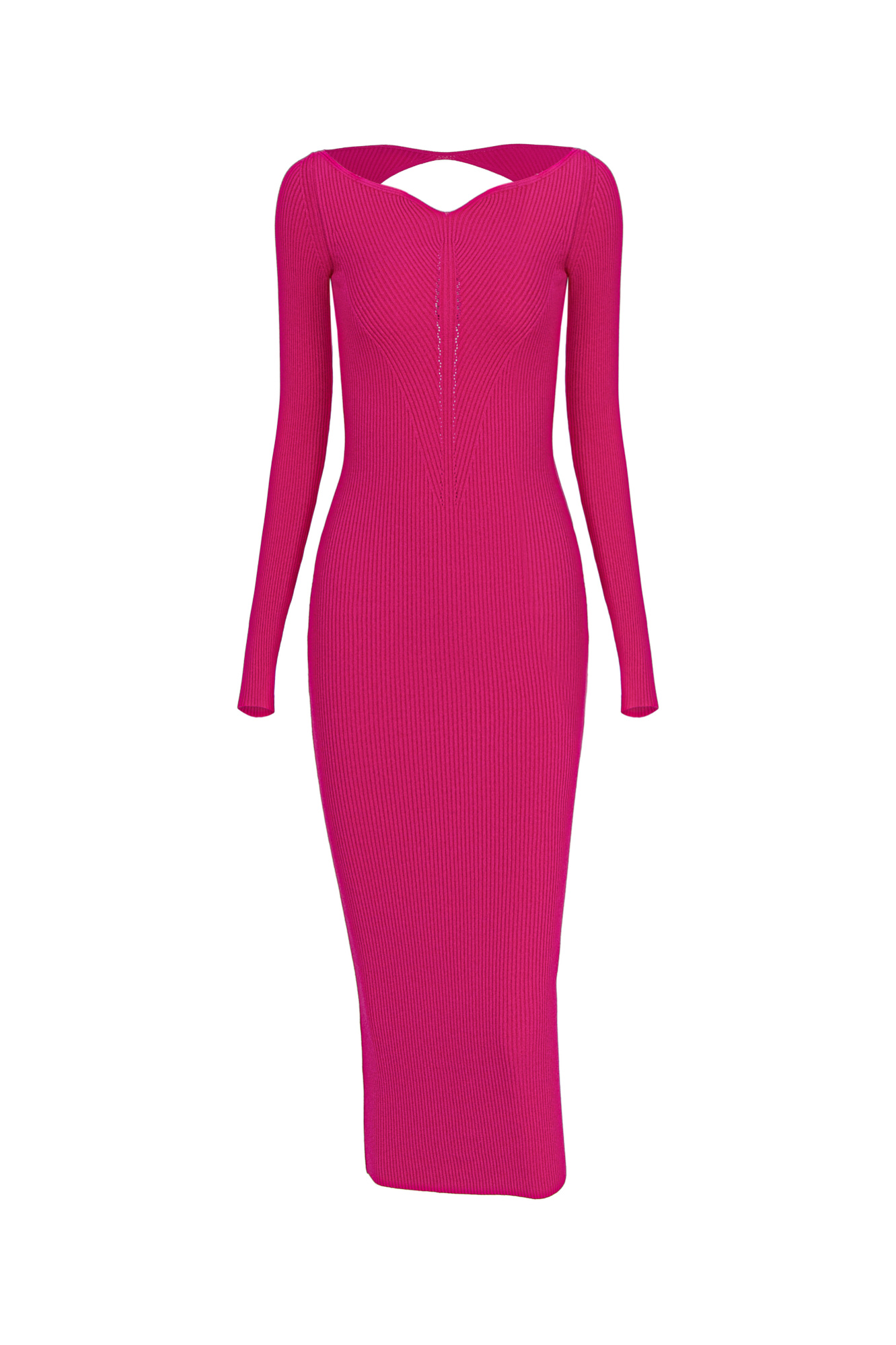 Трикотажное платье длины миди из вискозы. Модель по фигуре с длинными рукавами, вывязанным фигурным вырезом декольт и открытой спиной.