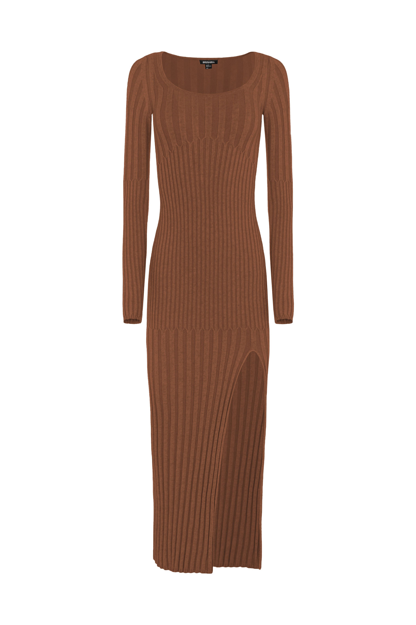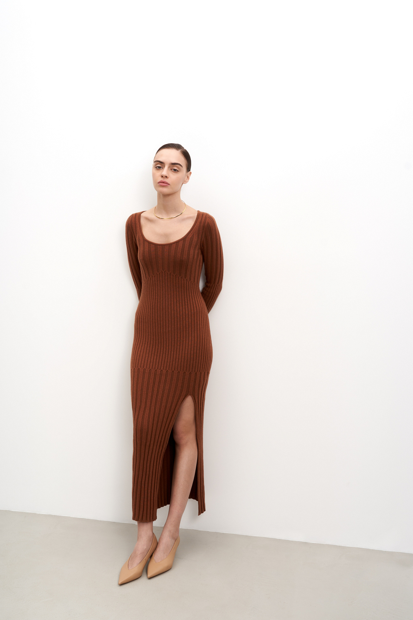 Трикотажное платье из шерсти с добавлением кашемира. Модель приталенного силуэта с разрезом сбоку.