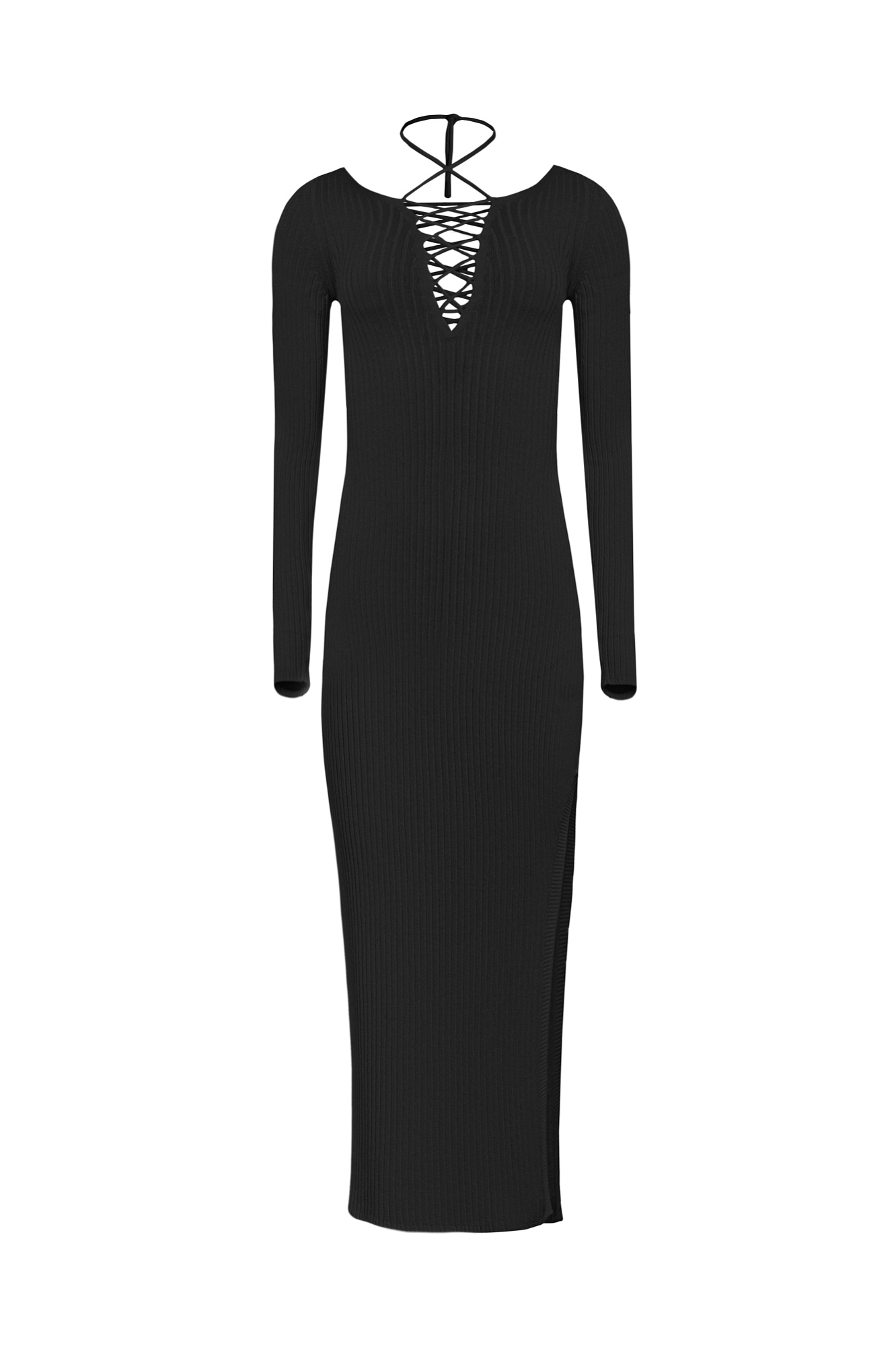 Длинное платье из вискозы с разрезом сбоку. Двойная шнуровка на груди и спине.