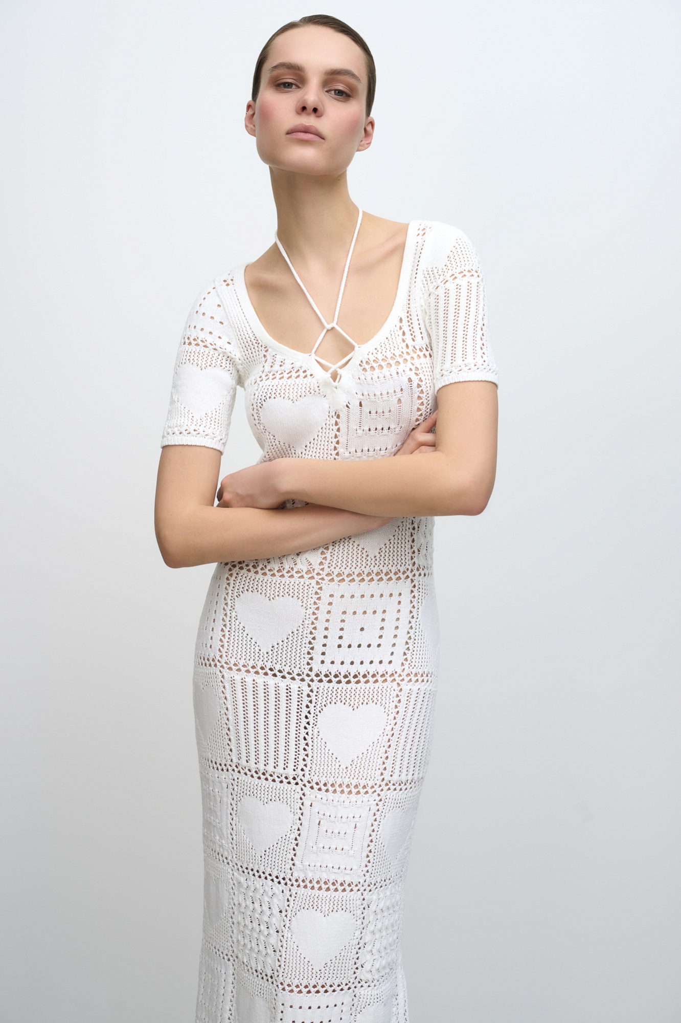 Трикотажное ажурное платье длины миди, выполненное в стиле печворк. Модель приталенного силуэта, с коротким рукавом и кулиской, фиксируемой на шее.