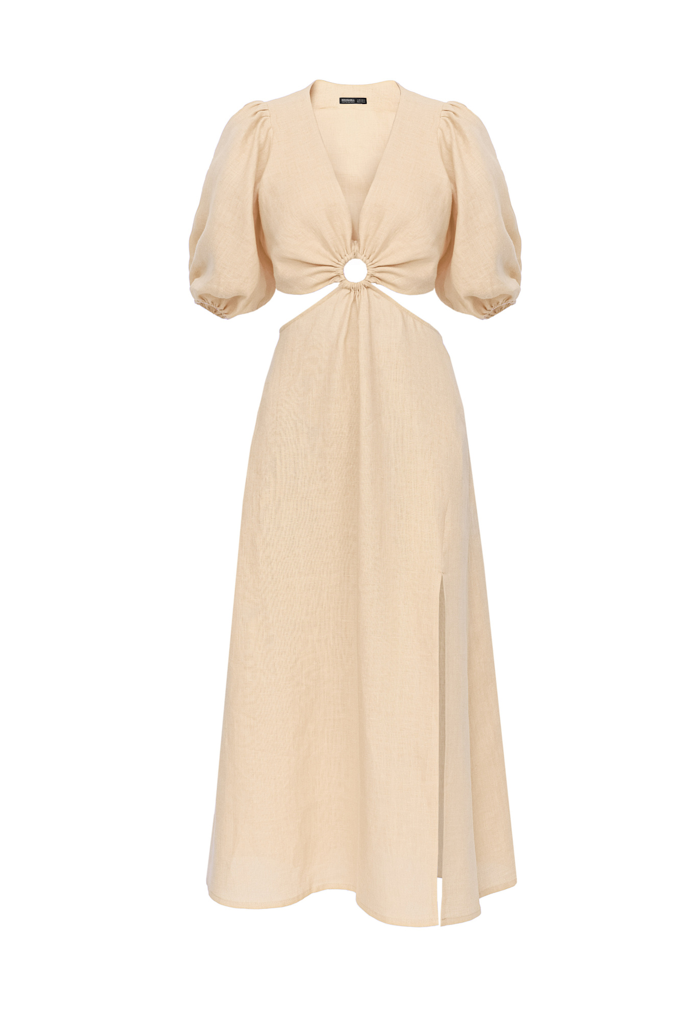 Плать из 100% льна с разрезом сбоку и вырезом на талии. Рукава-фонарики.