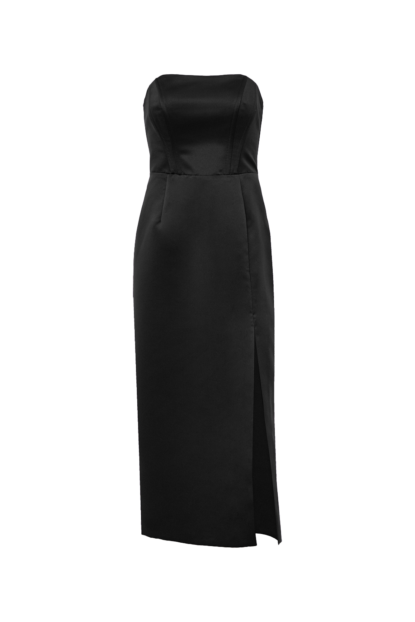 Длинное корсетное платье без рукавов с разрезом сбоку. Застежка на молнию сзади.