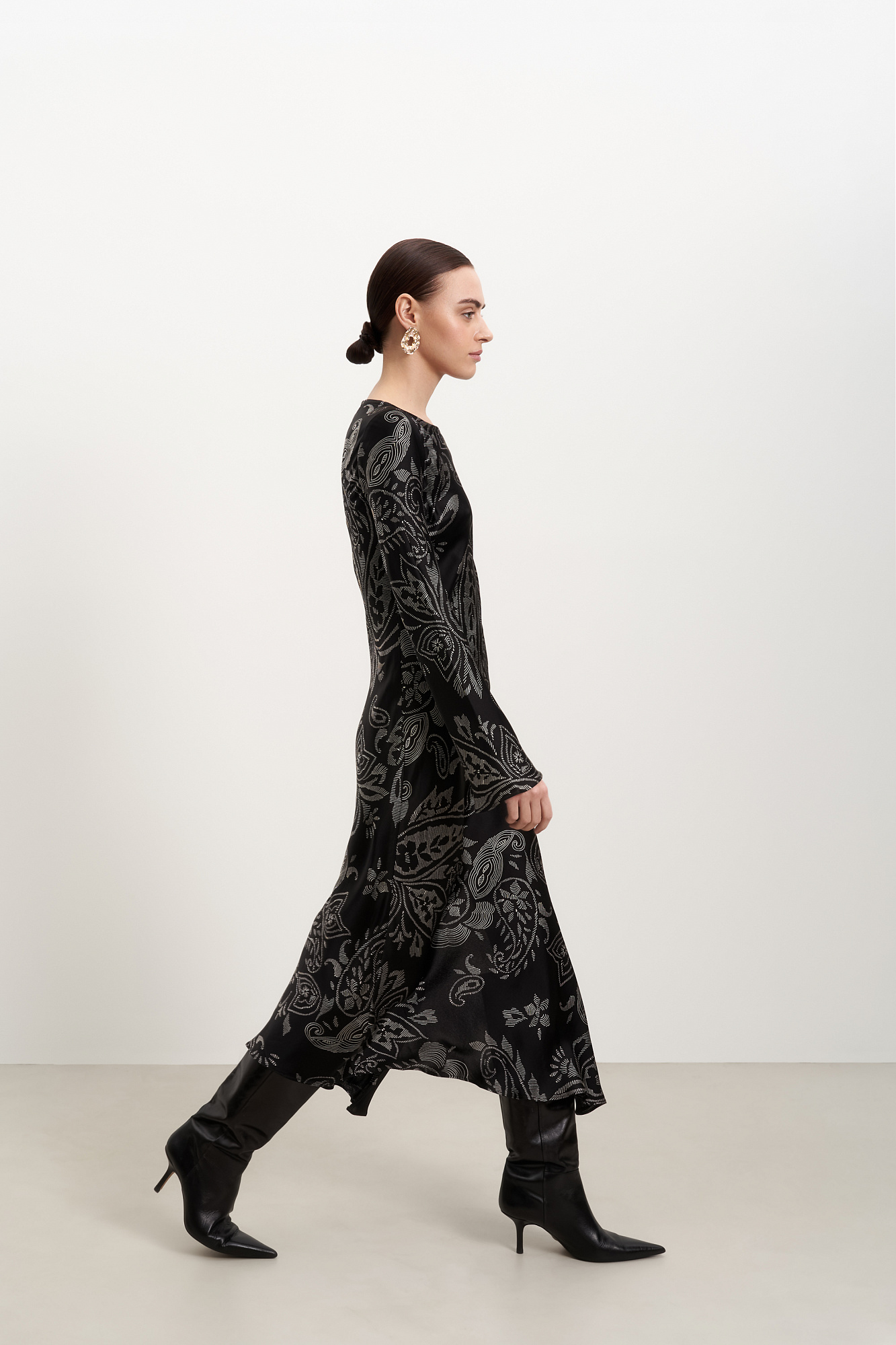 Атласное платье из 100% вискозы с принтом. Модель приталенного силуэта длины миди.
