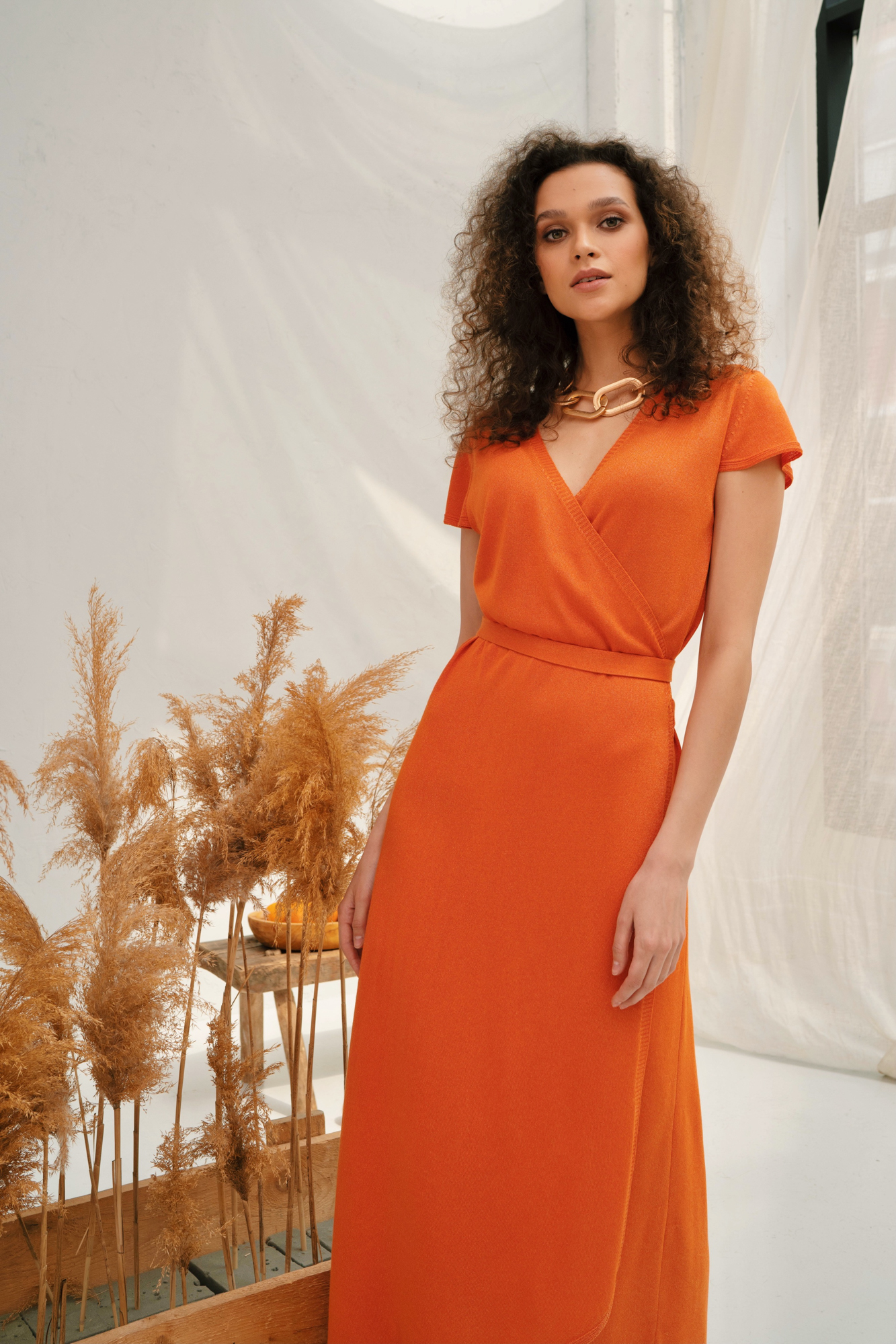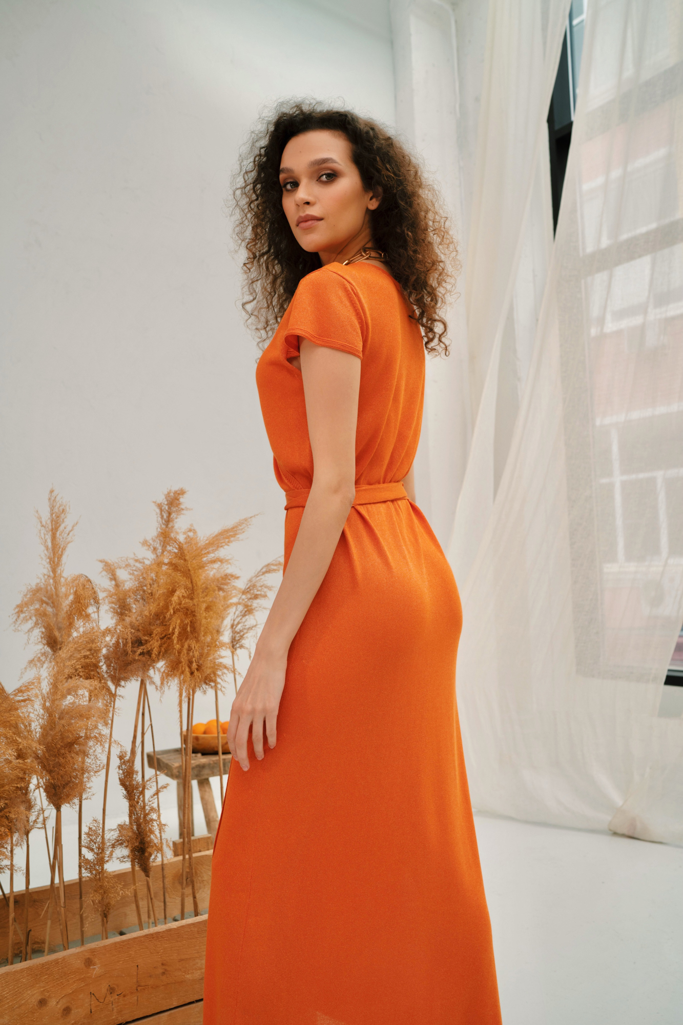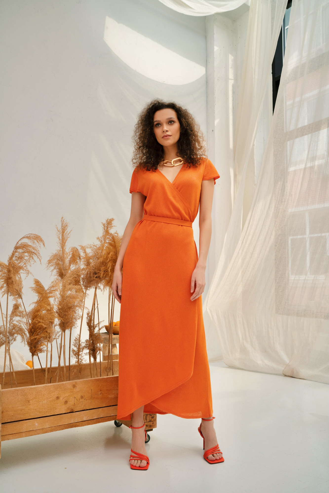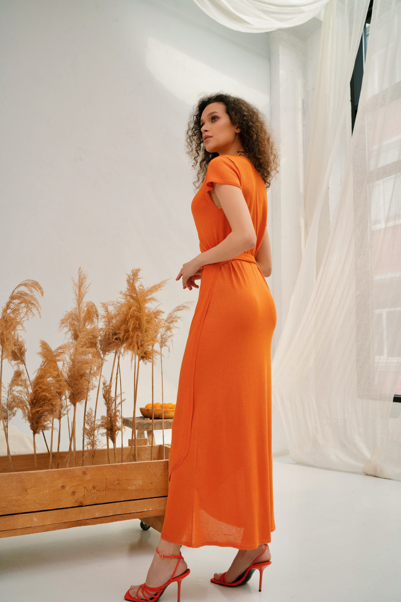 Лёгкое трикотажное платье станет прекрасным спутником летних дней. V-образный вырез идеально подходит для объёмных аксессуаров, а асимметричный край юбки добавляет образу элегантности.