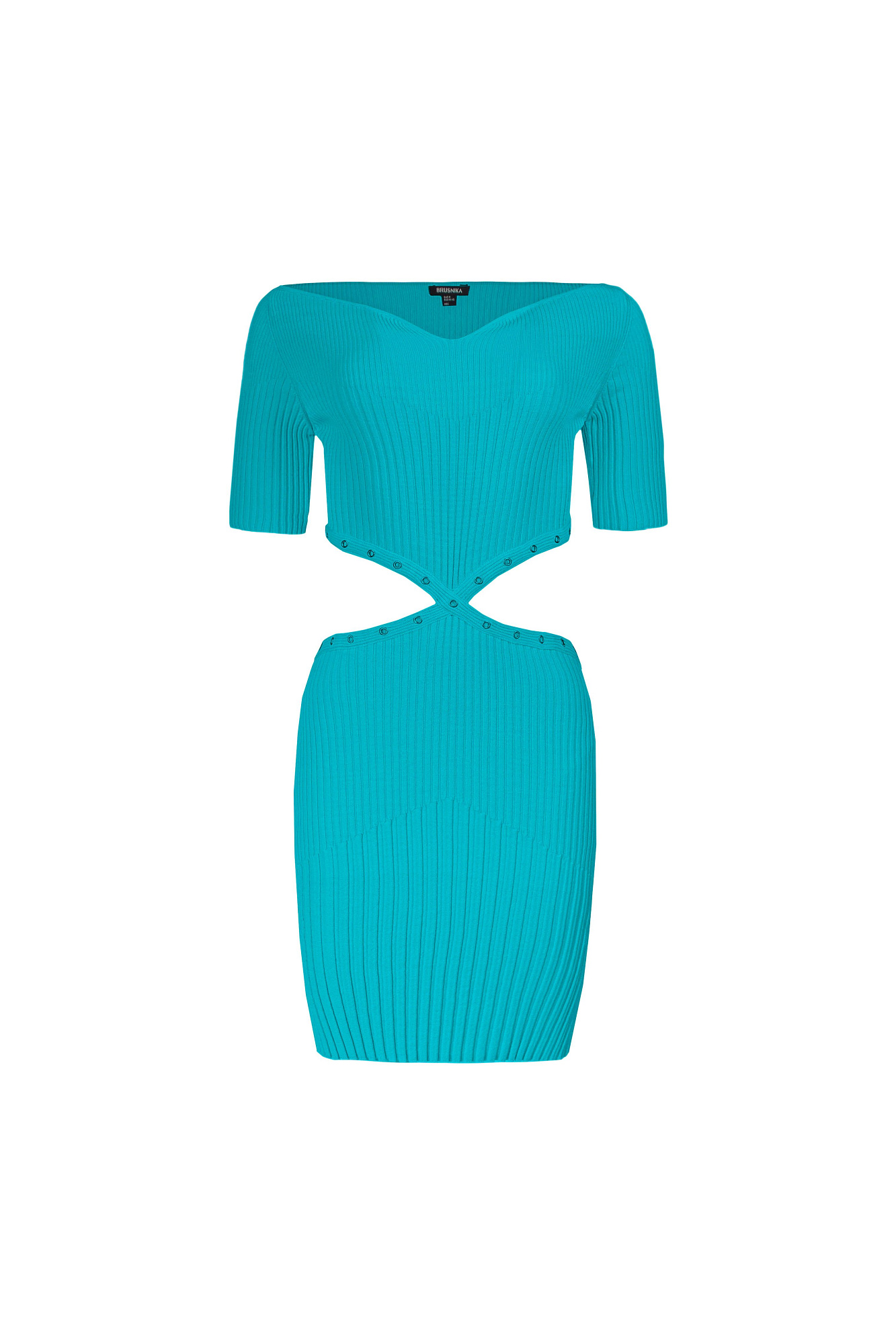 Трикотажное платье в широкий рубчик с вырезами по бокам и короткими рукавами.