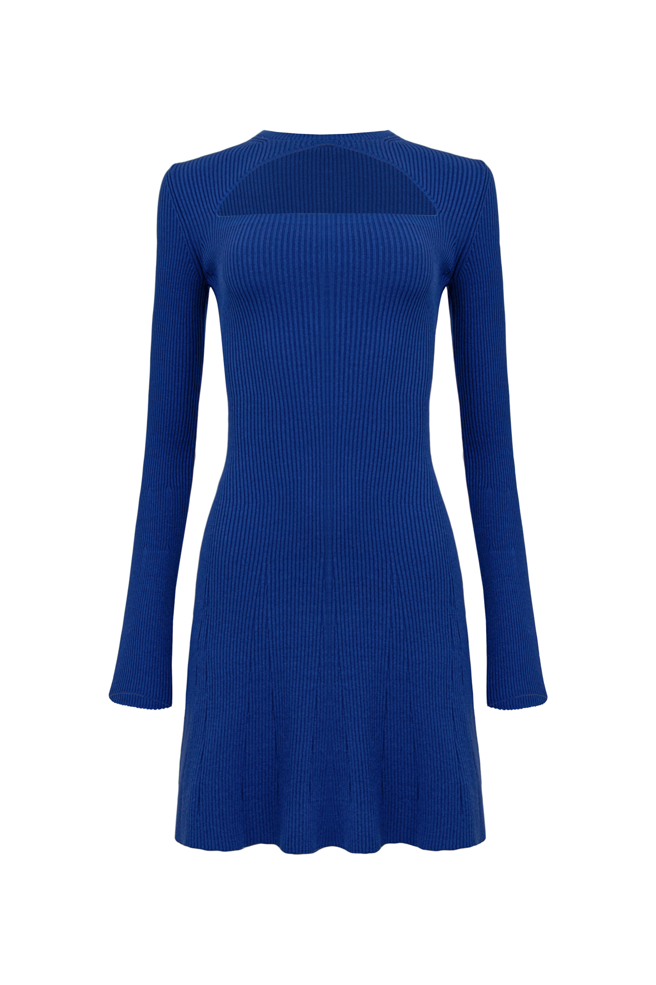 Трикотажное платье силуэта песочные часы. Модель длины мини с вырезом на груди и расклешенными рукавами.
