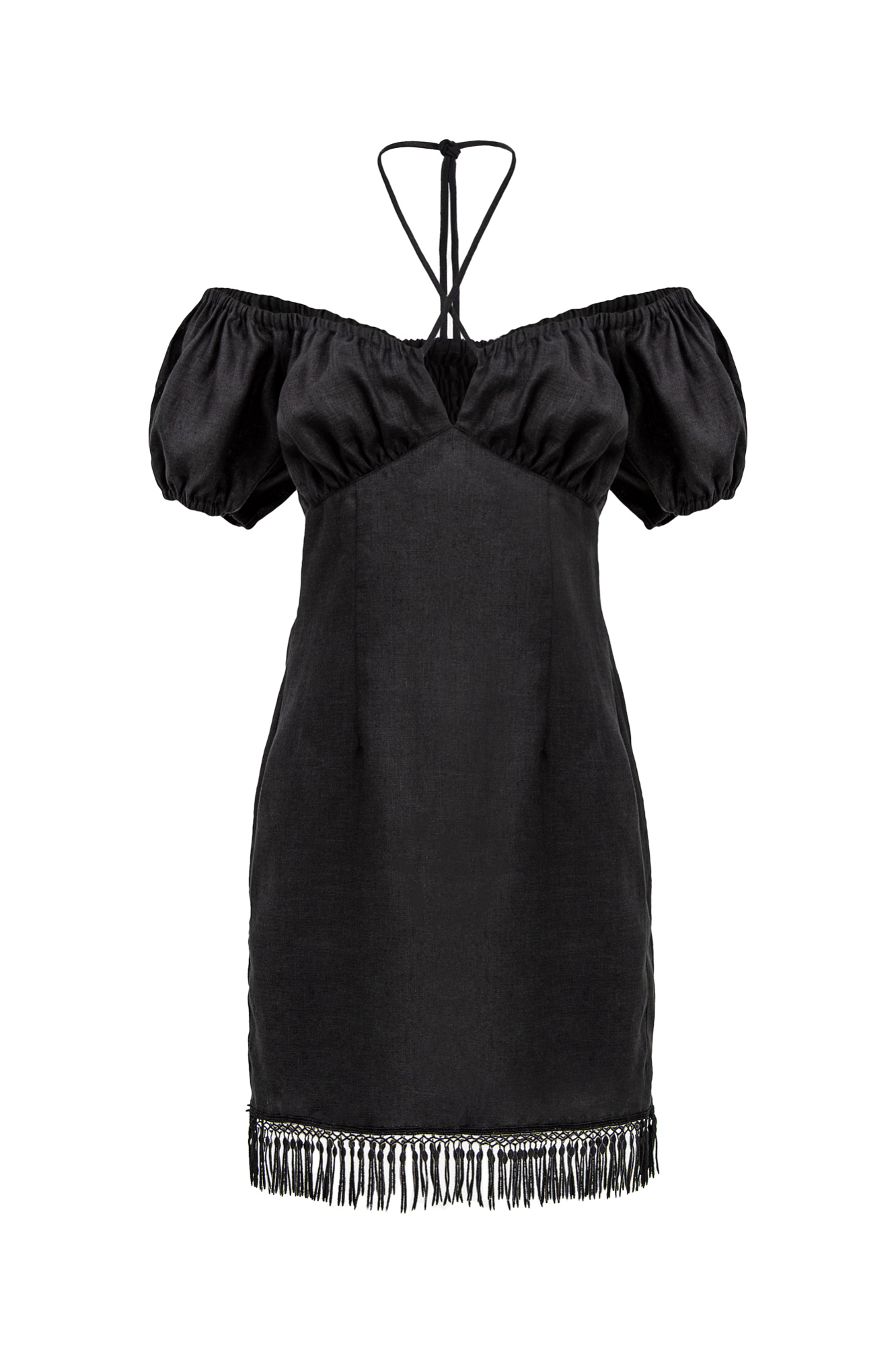 Платье из 100% льна с бахромой и на тонкой кулиске вокруг шеи.