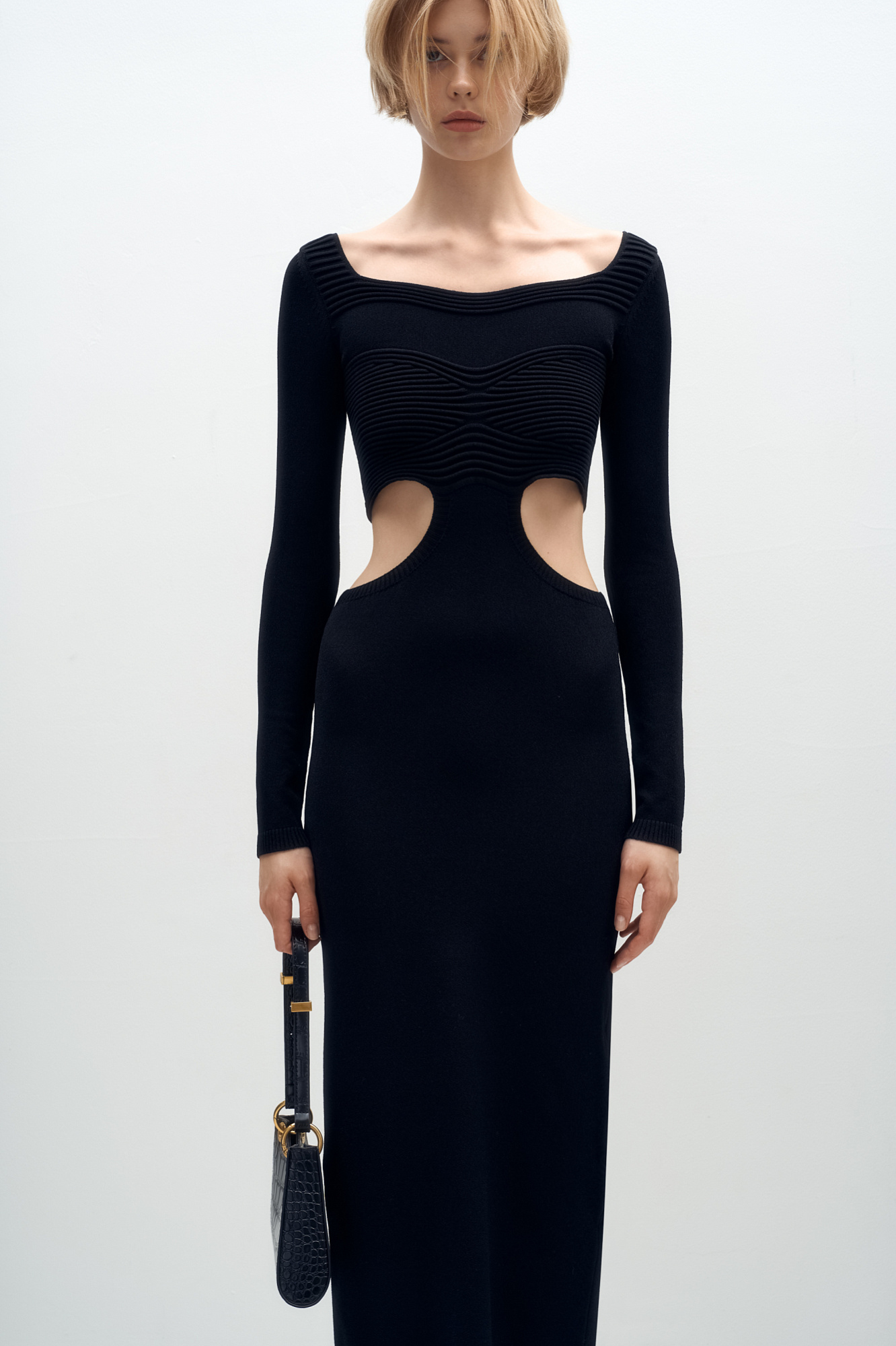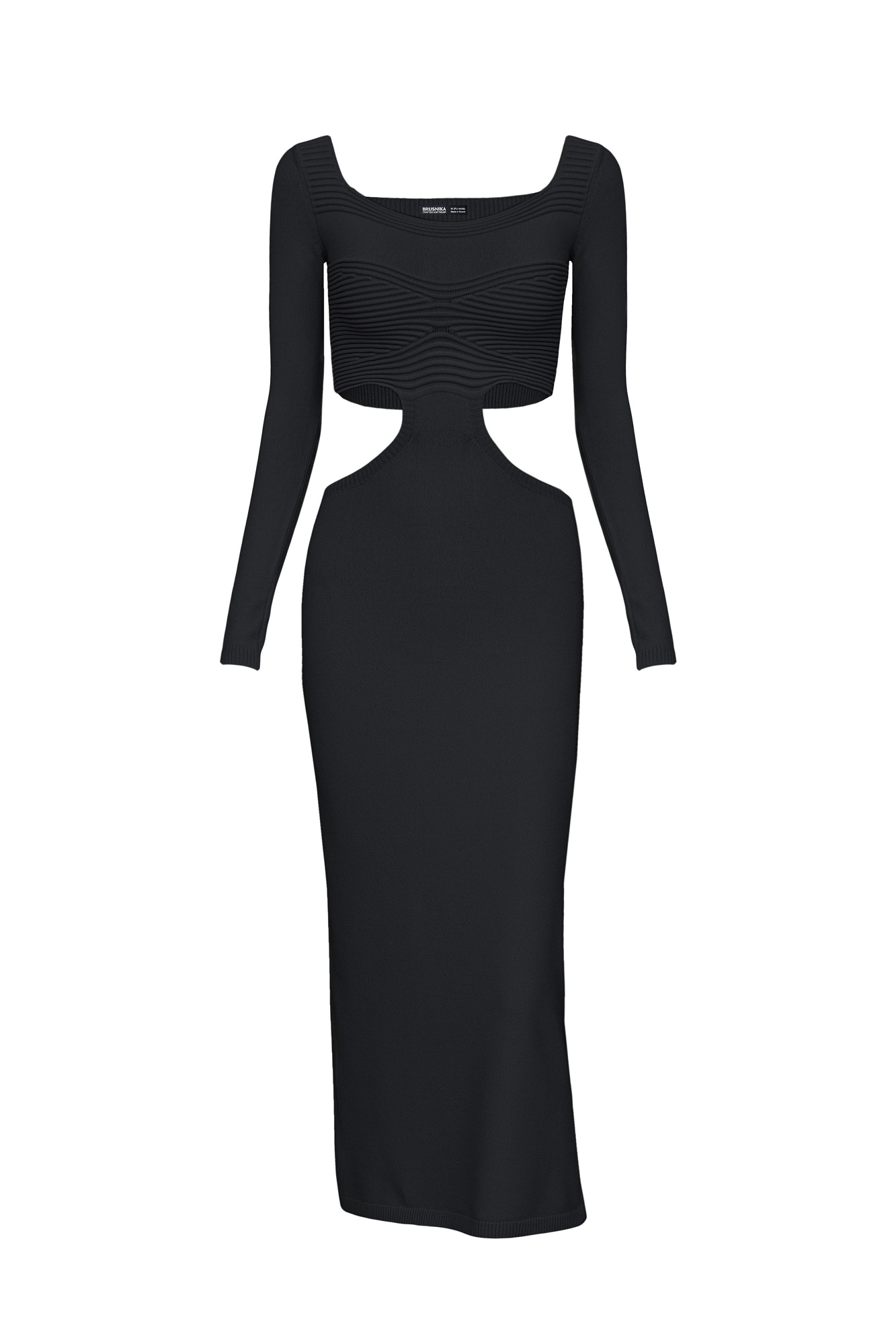 Трикотажное платье из вискозы. Модель приталенного силуэта длины миди. Верх изделия с разрезами по бокам и открытой спинкой.