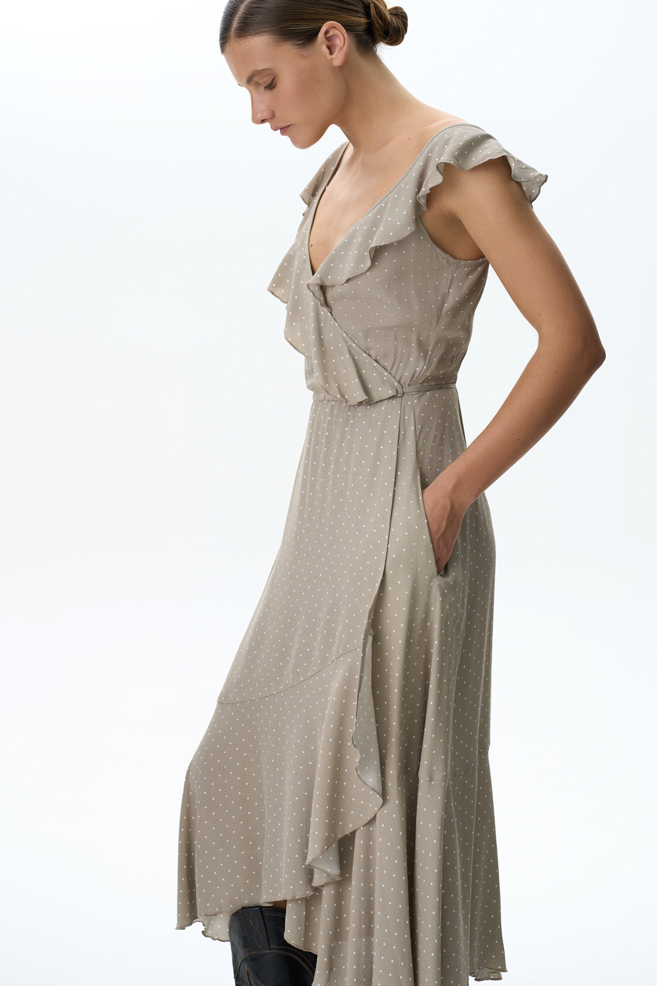 Сарафан в мелкий горох из 100% вискозы на запах, с V-образным вырезом и асимметричным низом.