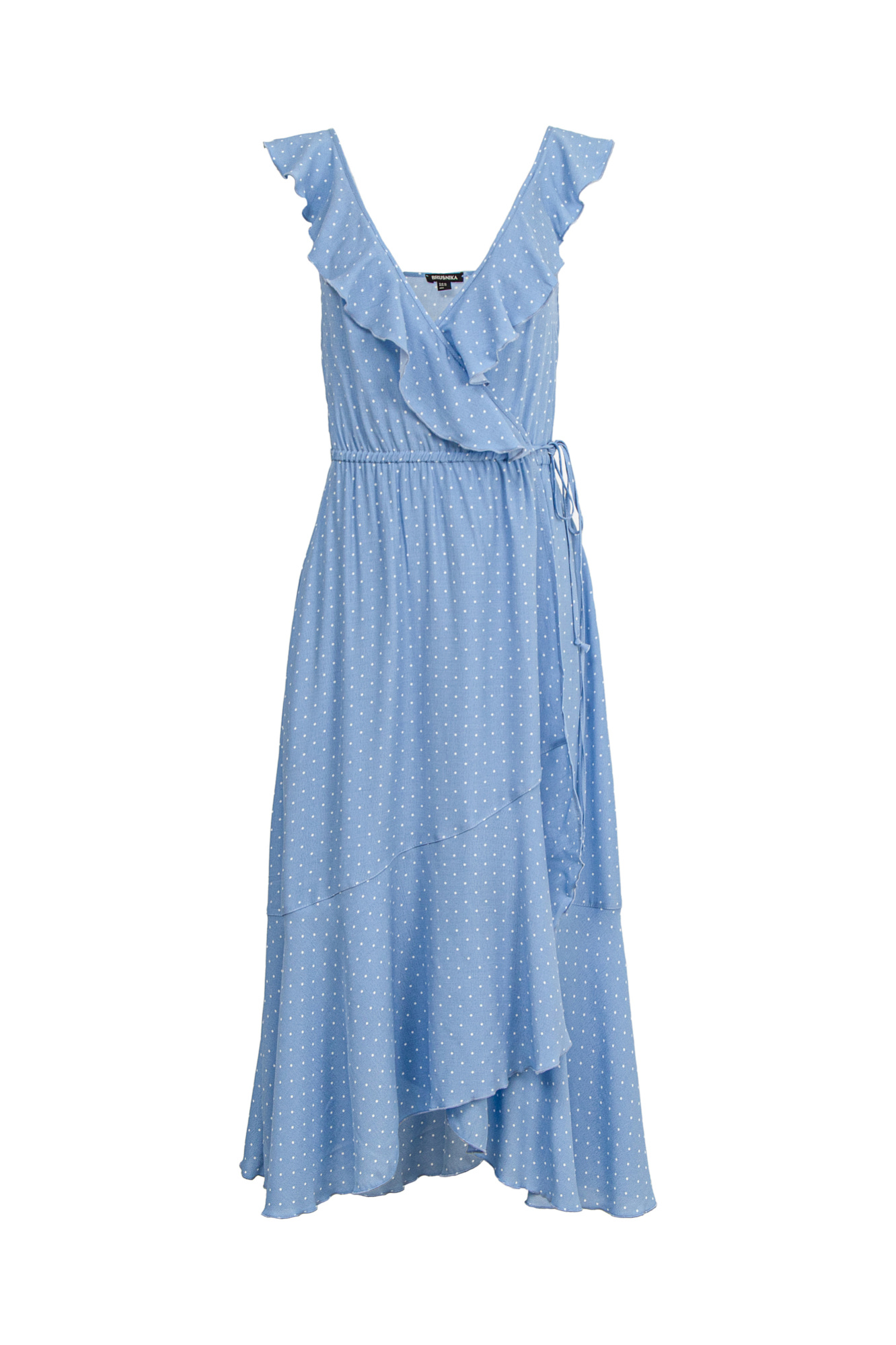 Сарафан в мелкий горох из 100% вискозы на запах, с V-образным вырезом и асимметричным низом.