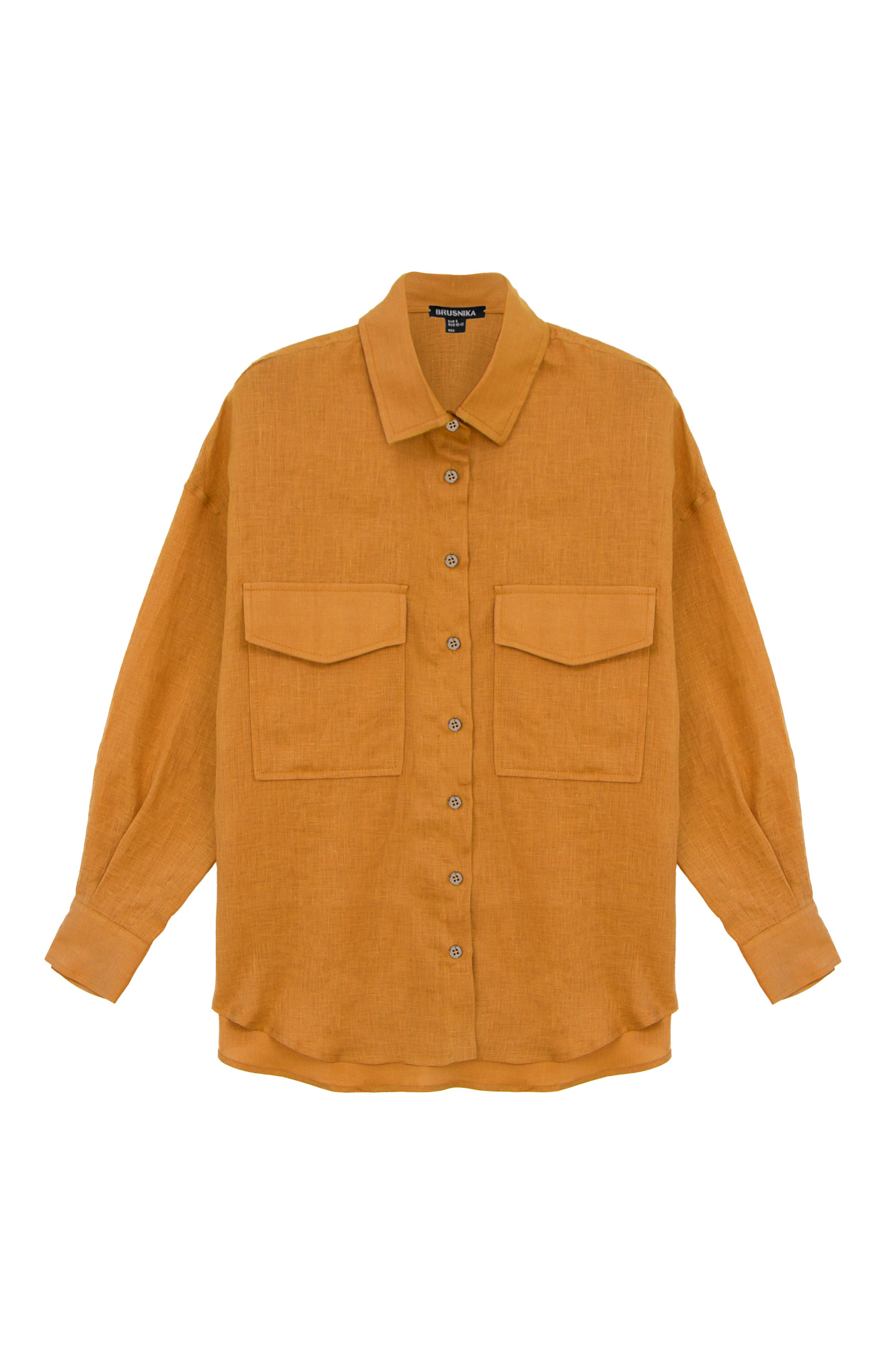 Льняная рубашка свободного кроя с накладными карманами на груди и удлиненной спинкой.