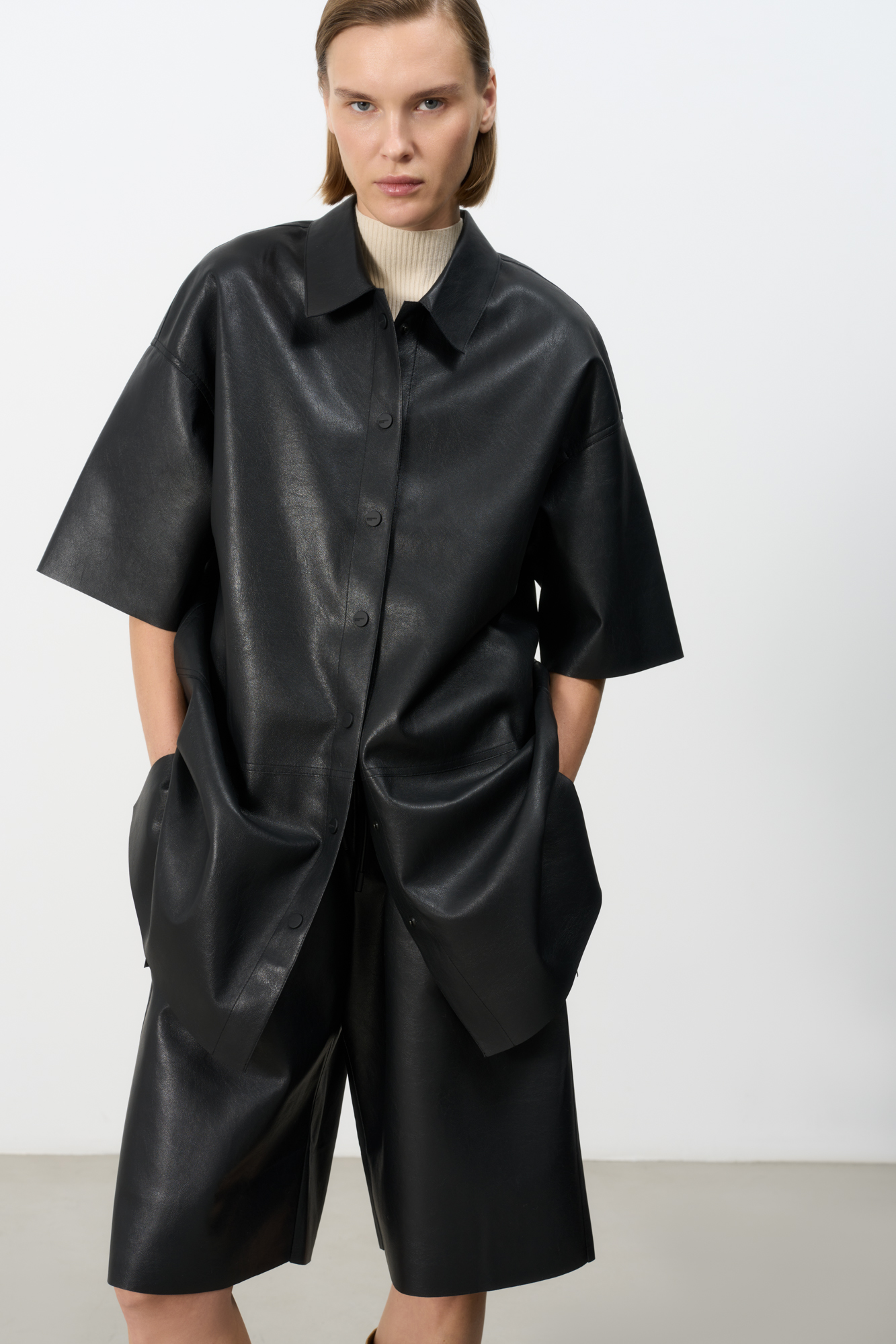 Рубашка из экокожи без подкладки с удлиненной спинкой и спущенной линией плеча. Застежка на кнопки.