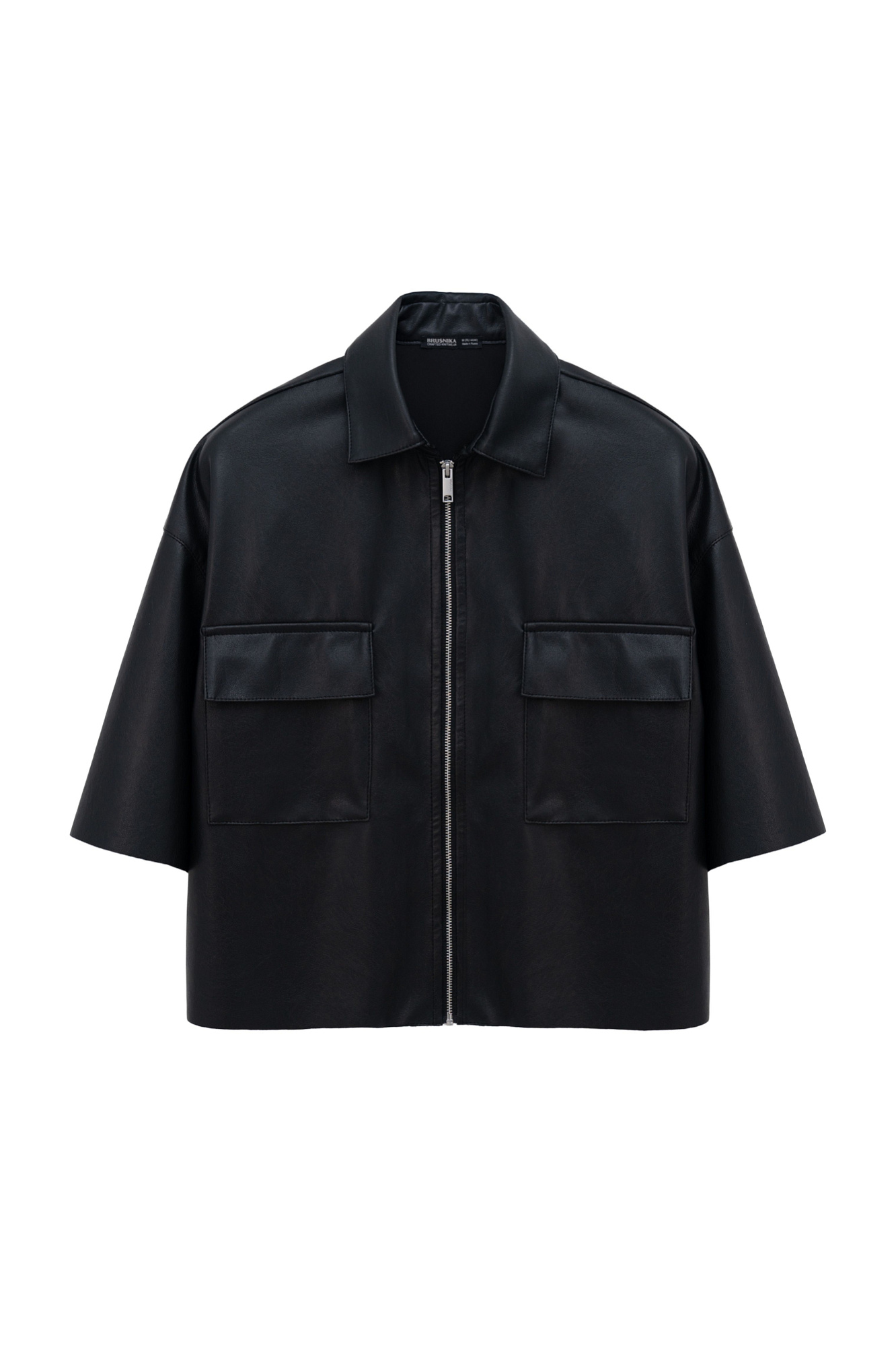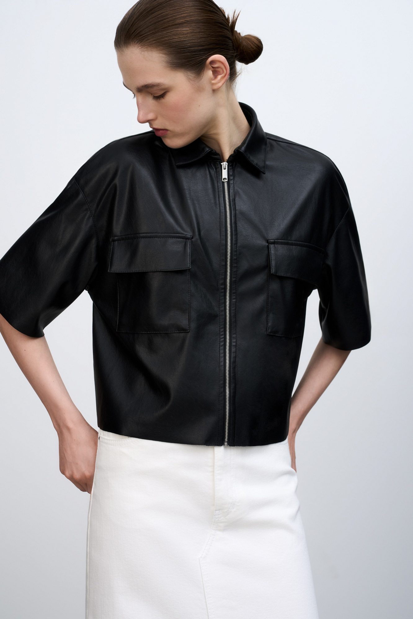 Укороченная рубашка из экокожи. Модель свободного силуэта со спущенной линией плеча, накладными карманами на груди и застежкой на молнию.