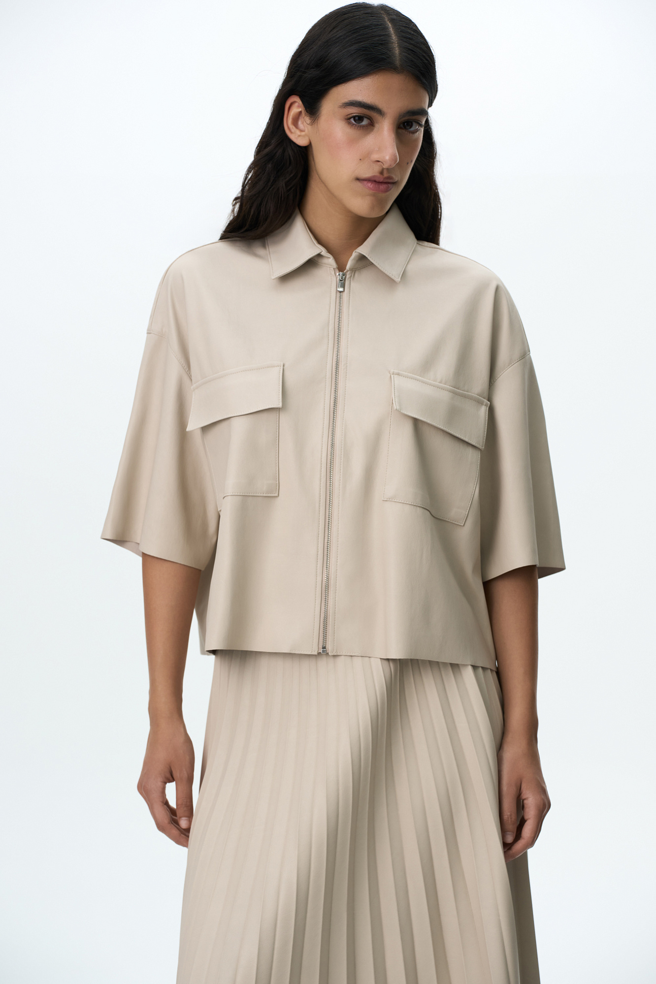 Укороченная рубашка из экокожи. Модель свободного силуэта со спущенной линией плеча, накладными карманами на груди и застежкой на молнию.