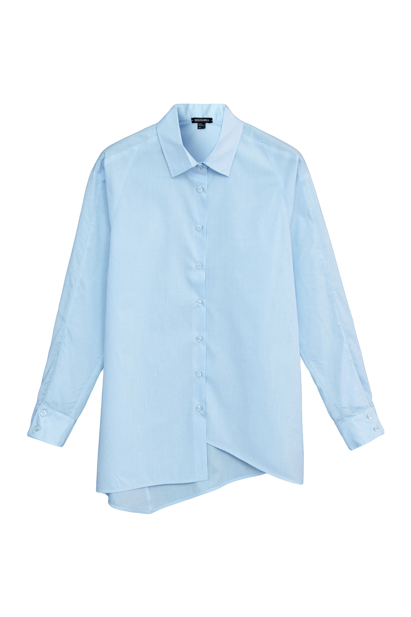 Рубашка на пуговицах с расклешенными рукавами, регулируемым манжетом и асимметричным краем.