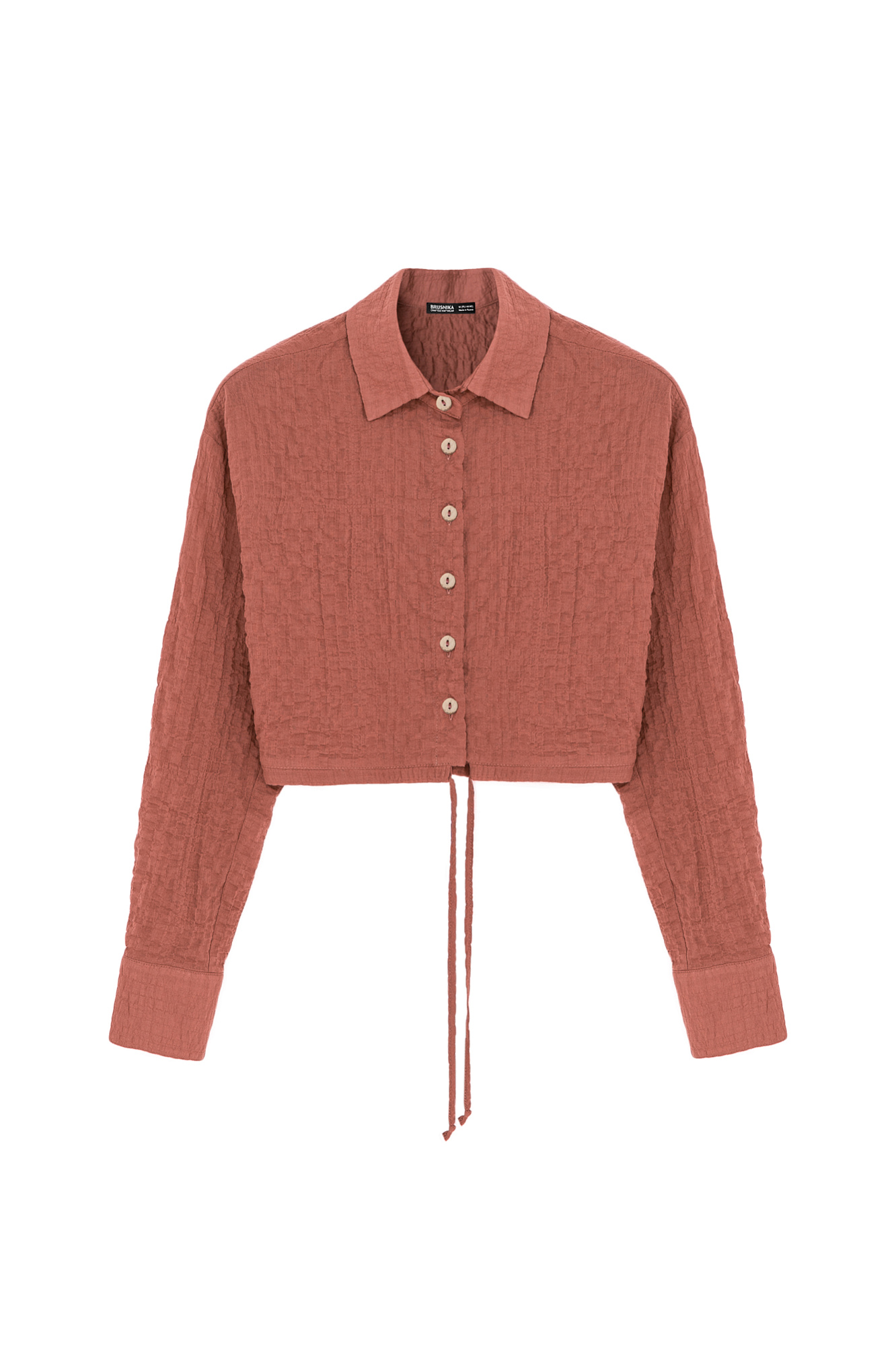 Укороченная рубашка из текстурной марлевки. Модель прямого кроя, с длинными рукавами, классическим отложным воротником, кулиской по низу и застежкой на пуговицы.