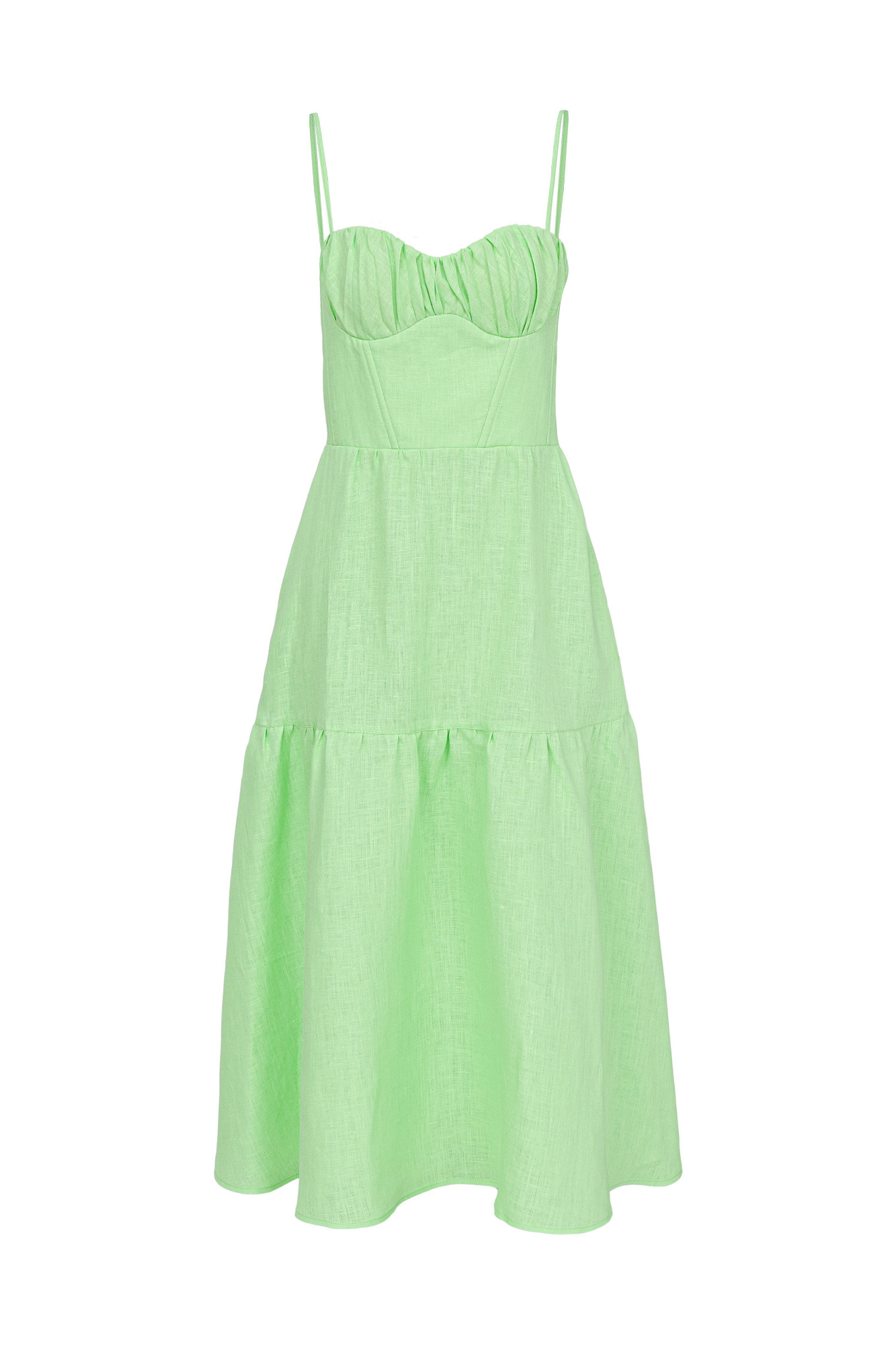 Сарафан из 100% льна. Модель на тонких регулируемых бретелях. Лиф с вшитыми чашечками, декорирован драпировкой. Верх сарафана выполнен в стиле корсета с резинкой на спинке.